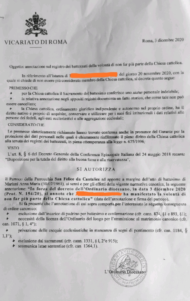 Una persona ha chiesto la rettifica dei dati relativi al proprio battesimo avvenuto a S. Felice da Cantalice - ROMA (RM) il 03/12/2020, dichiarando di non voler più far parte della Chiesa Cattolica.