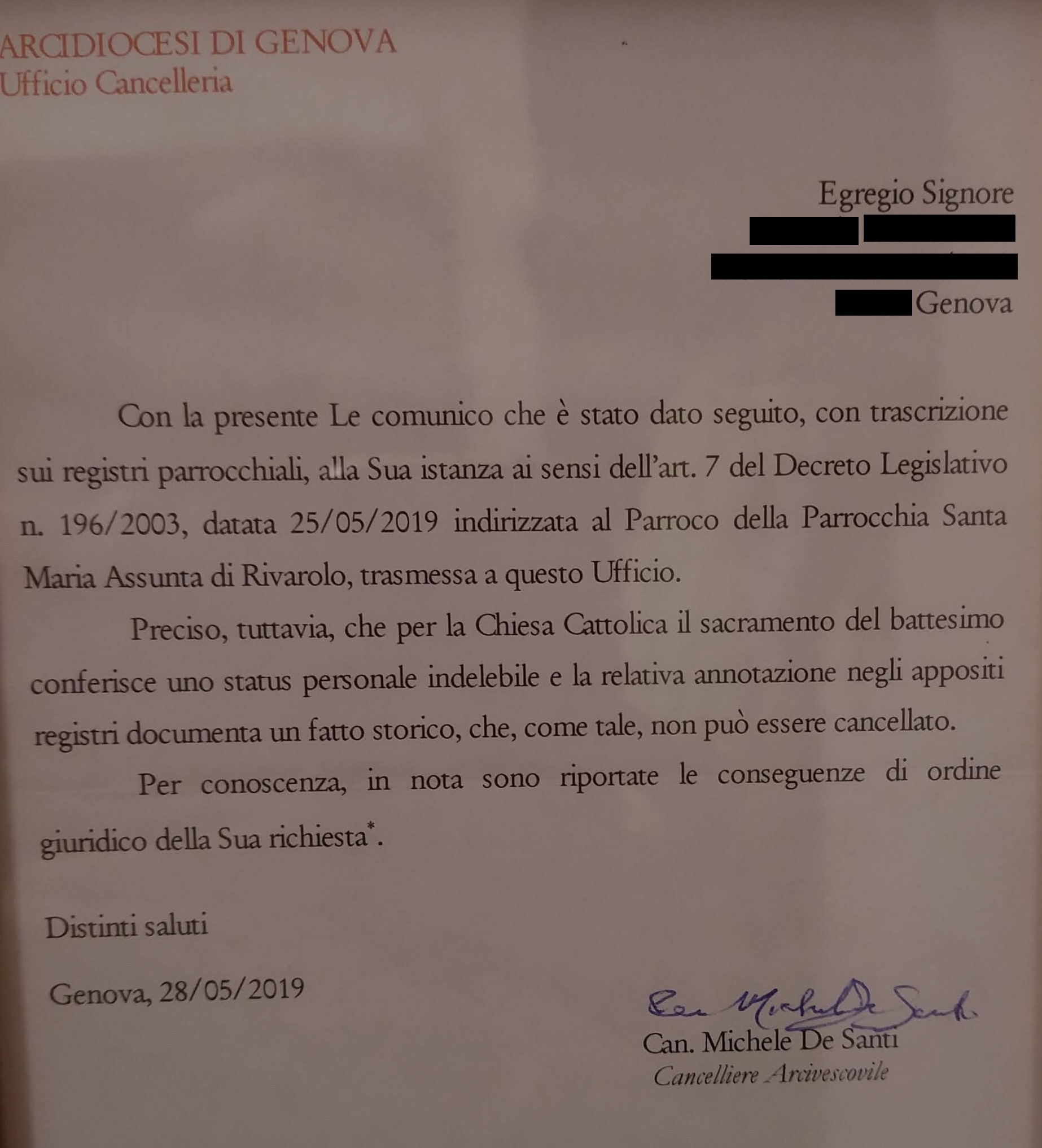 Una persona ha chiesto la rettifica dei dati relativi al proprio battesimo avvenuto a S. Maria Assunta - GENOVA (GE) il 28/05/2019, dichiarando di non voler più far parte della Chiesa Cattolica.