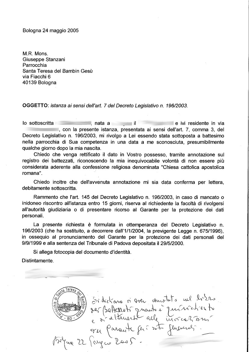 Una persona ha chiesto la rettifica dei dati relativi al proprio battesimo avvenuto a S. Teresa del Bambino Gesù - BOLOGNA (BO) il 27/06/2005, dichiarando di non voler più far parte della Chiesa Cattolica.