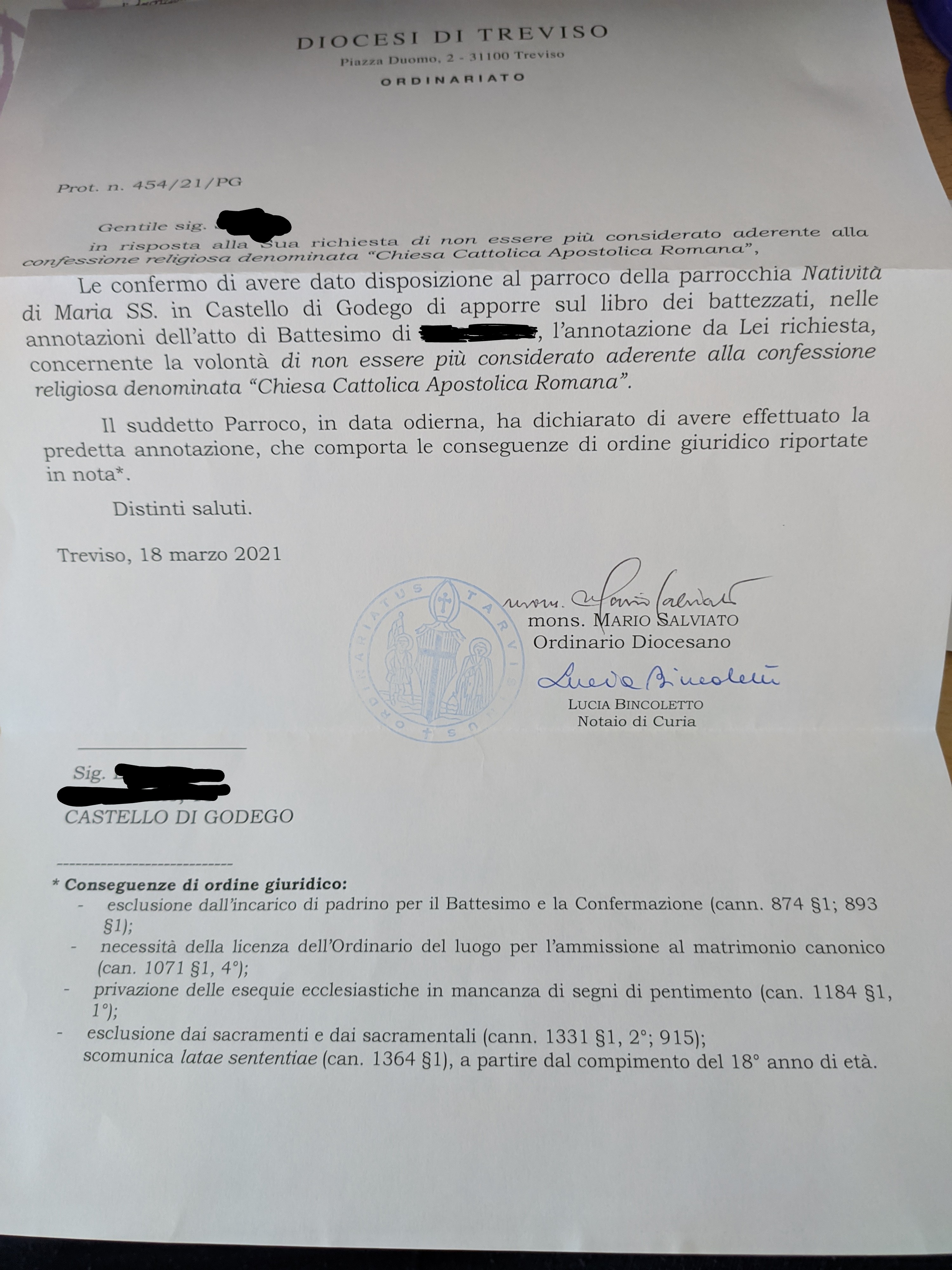 Una persona ha chiesto la rettifica dei dati relativi al proprio battesimo avvenuto a Natività di Maria Ss. - CASTELLO DI GODEGO (TV) il 18/03/2021, dichiarando di non voler più far parte della Chiesa Cattolica.