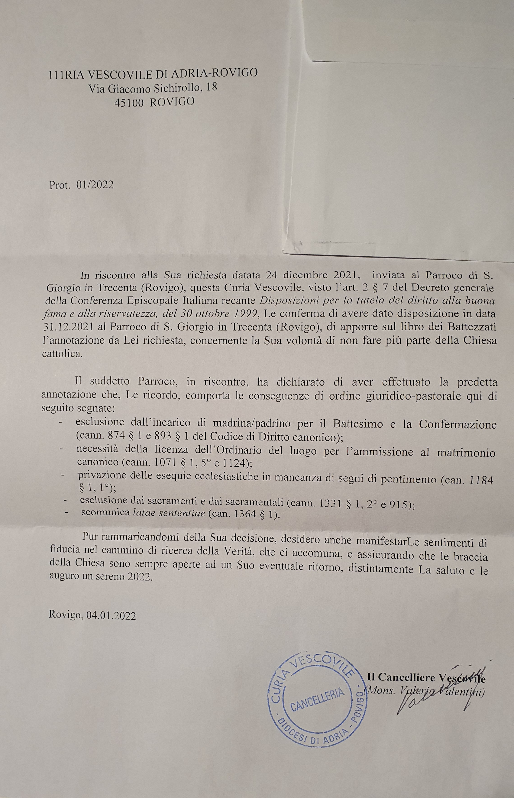 Una persona ha chiesto la rettifica dei dati relativi al proprio battesimo avvenuto a S. Giorgio Martire - TRECENTA (RO) il 04/01/2022, dichiarando di non voler più far parte della Chiesa Cattolica.