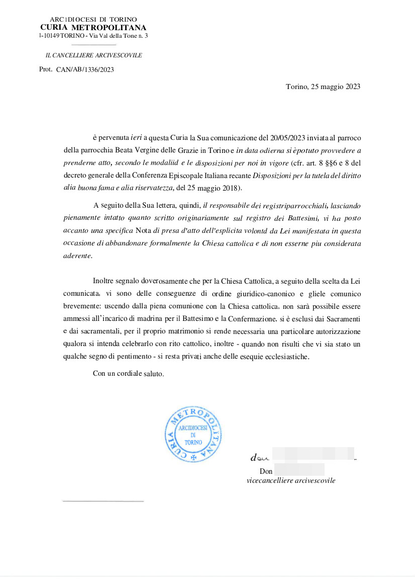 Una persona ha chiesto la rettifica dei dati relativi al proprio battesimo avvenuto a Beata Vergine delle Grazie - TORINO (TO) il 16/06/2023, dichiarando di non voler più far parte della Chiesa Cattolica.