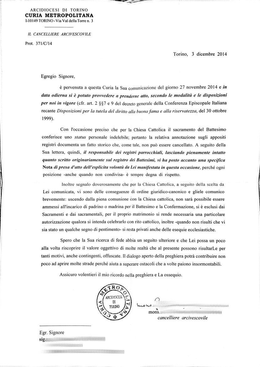 Affinché lo sbattezzo fosse effettivo ho prima dovuto mandare una raccomandata al parroco che mi ha risposto di non potere eseguire la cancellazione sui registri parrocchiali. Ho dovuto quindi inviare una seconda raccomandata alla curia vescovile dell'arcidiocesi di Torino.