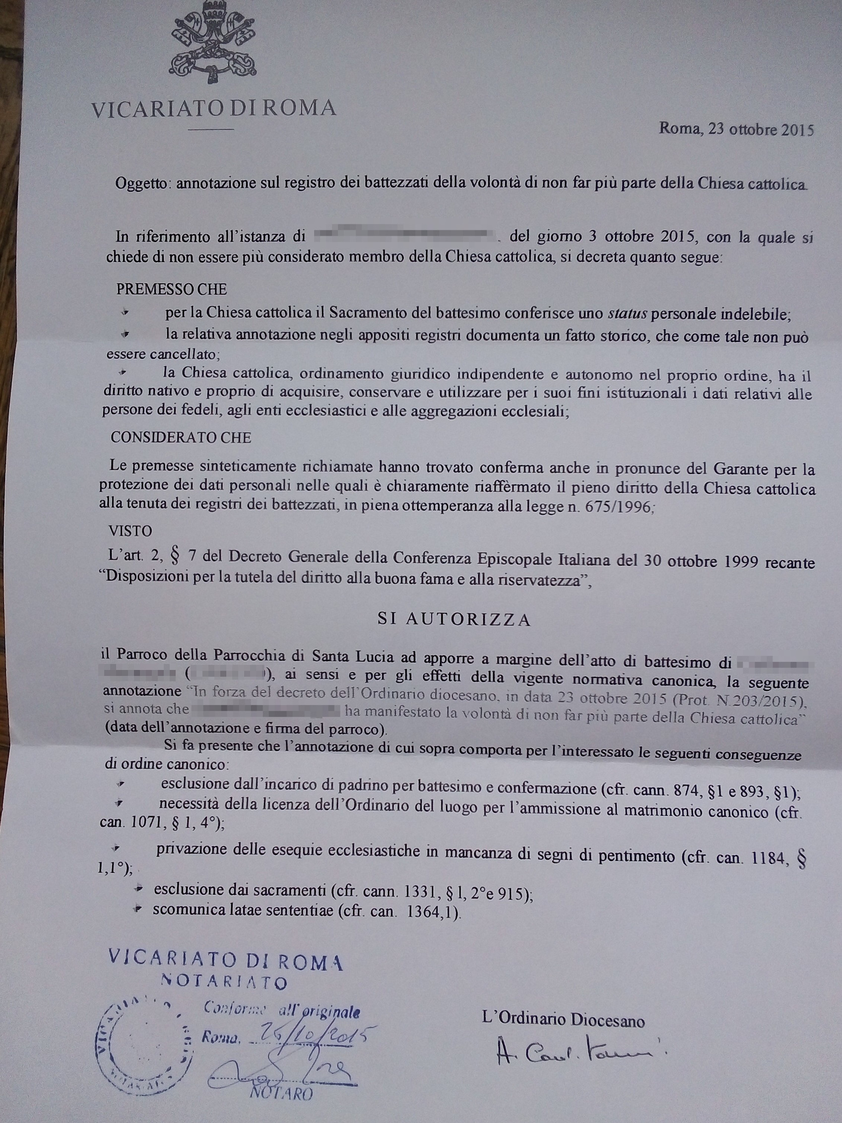 Una persona ha chiesto la rettifica dei dati relativi al proprio battesimo avvenuto a Santa Lucia - ROMA (RM) il 23/10/2015, dichiarando di non voler più far parte della Chiesa Cattolica.