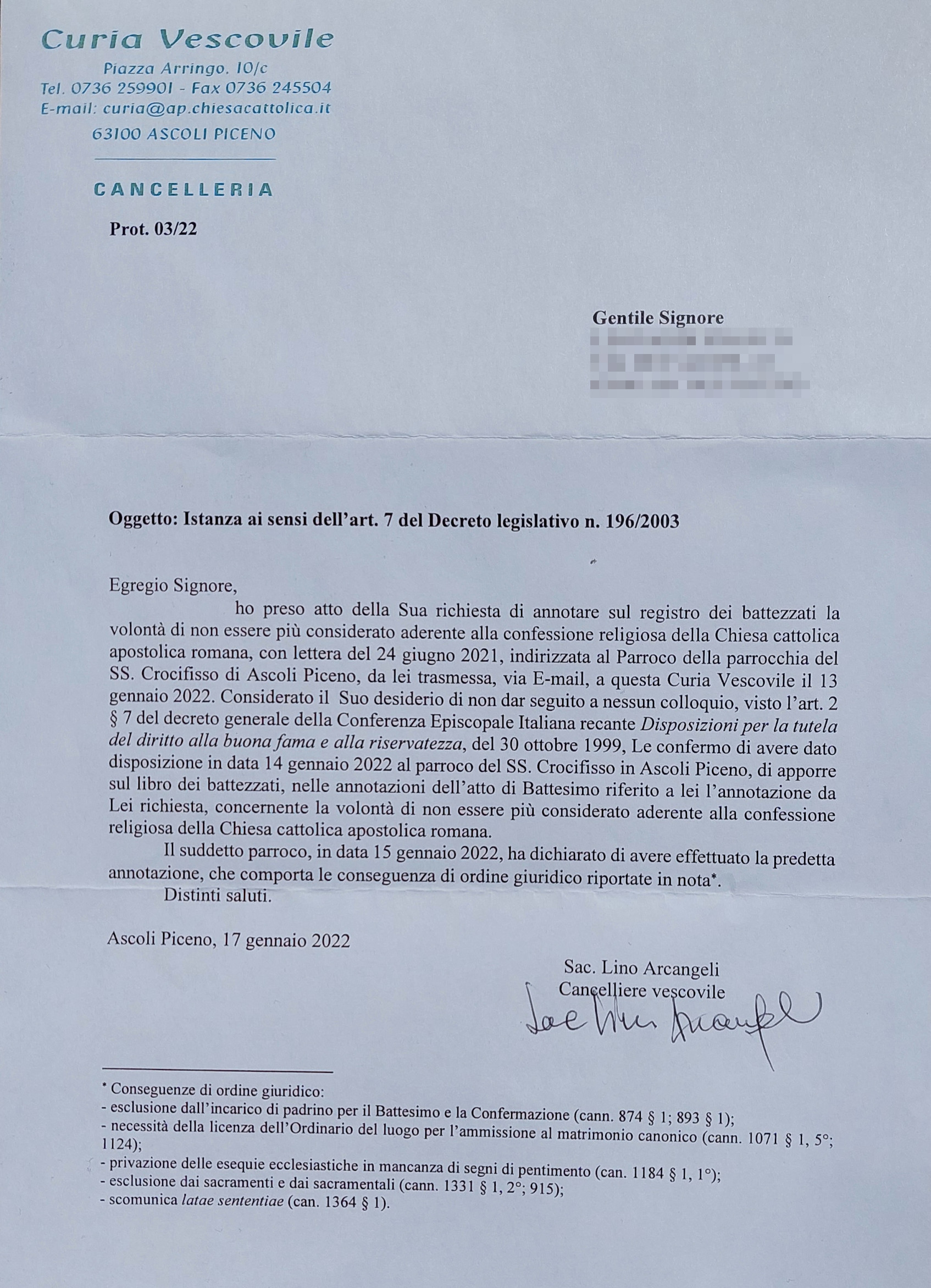 Una persona ha chiesto la rettifica dei dati relativi al proprio battesimo avvenuto a Ss. Crocifisso - ASCOLI PICENO (AP) il 17/01/2022, dichiarando di non voler più far parte della Chiesa Cattolica.
