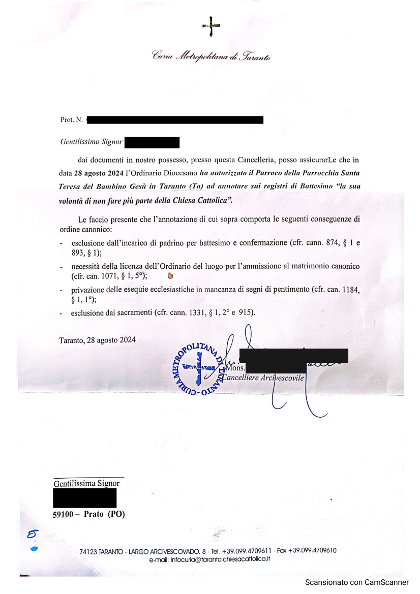 Una persona ha chiesto la rettifica dei dati relativi al proprio battesimo avvenuto a S. Teresa del Bambin Gesù - TARANTO (TA) il 28/08/2024, dichiarando di non voler più far parte della Chiesa Cattolica.