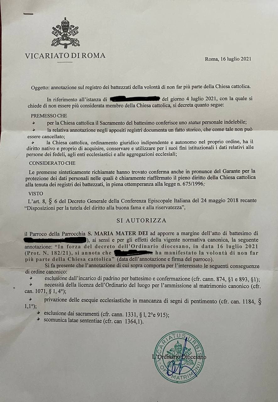 Una persona ha chiesto la rettifica dei dati relativi al proprio battesimo avvenuto a S. Maria Mater Dei - ROMA (RM) il 16/07/2021, dichiarando di non voler più far parte della Chiesa Cattolica.