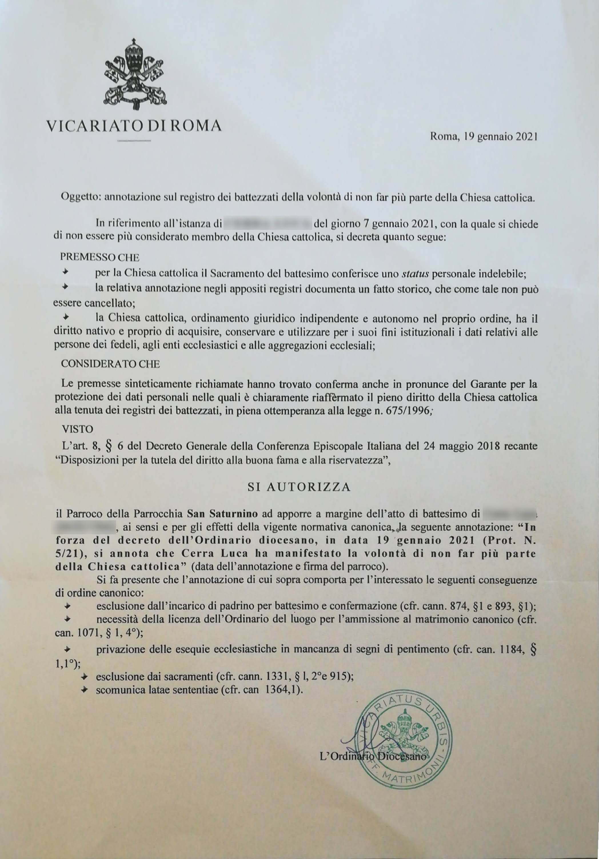 Una persona ha chiesto la rettifica dei dati relativi al proprio battesimo avvenuto a S. Saturnino - ROMA (RM) il 19/01/2021, dichiarando di non voler più far parte della Chiesa Cattolica.