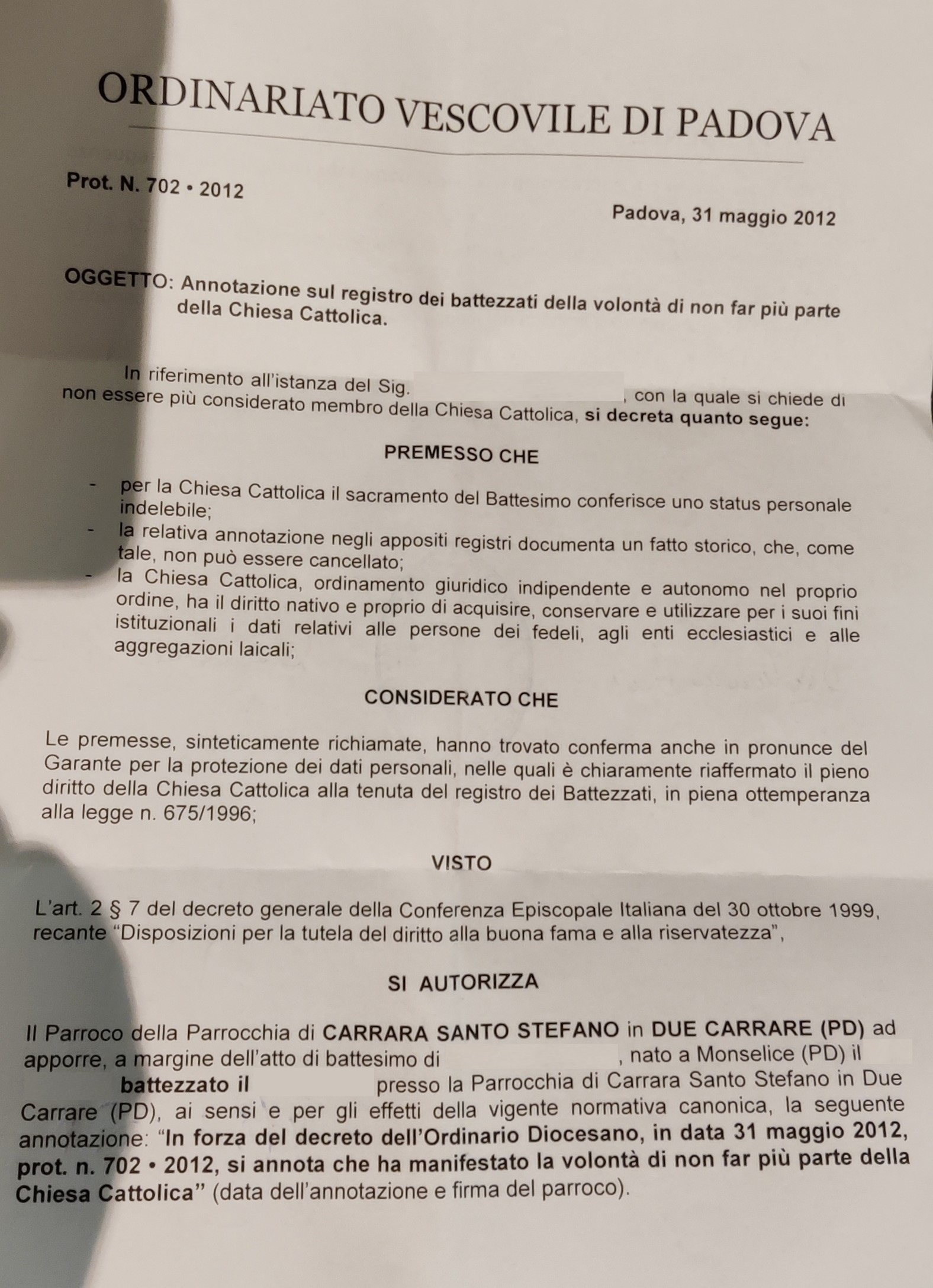 Una persona ha chiesto la rettifica dei dati relativi al proprio battesimo avvenuto a S. Stefano - DUE CARRARE (PD) il 31/05/2012, dichiarando di non voler più far parte della Chiesa Cattolica.