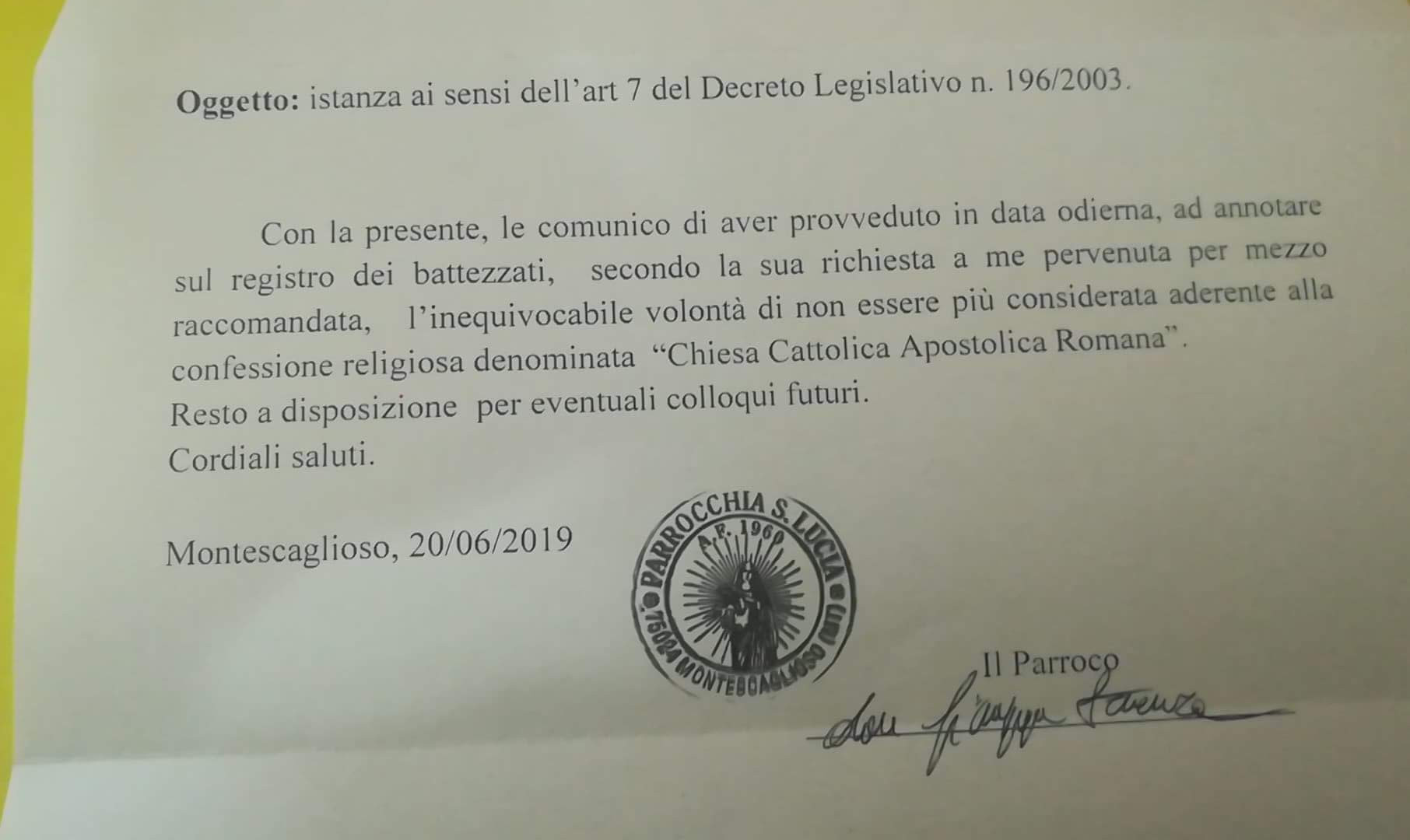 Una persona ha chiesto la rettifica dei dati relativi al proprio battesimo avvenuto a S. Lucia - MONTESCAGLIOSO (MT) il 20/06/2019, dichiarando di non voler più far parte della Chiesa Cattolica.