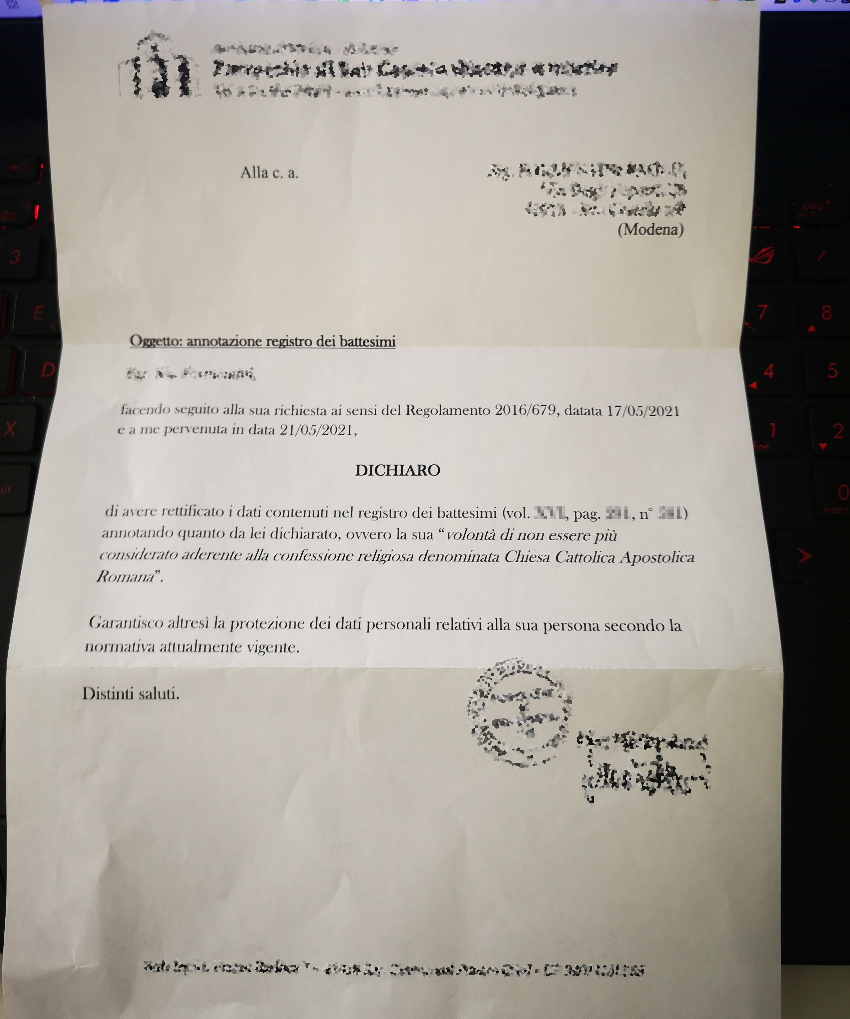 Una persona ha chiesto la rettifica dei dati relativi al proprio battesimo avvenuto a S. Cesario Diacono Martire - SAN CESARIO SUL PANARO (MO) il 26/05/2021, dichiarando di non voler più far parte della Chiesa Cattolica.