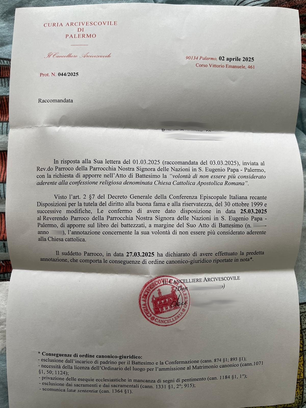 Una persona ha chiesto la rettifica dei dati relativi al proprio battesimo avvenuto a Nostra Signora delle Nazioni in S. Eugenio Papa - PALERMO (PA) il 02/04/2025, dichiarando di non voler più far parte della Chiesa Cattolica.