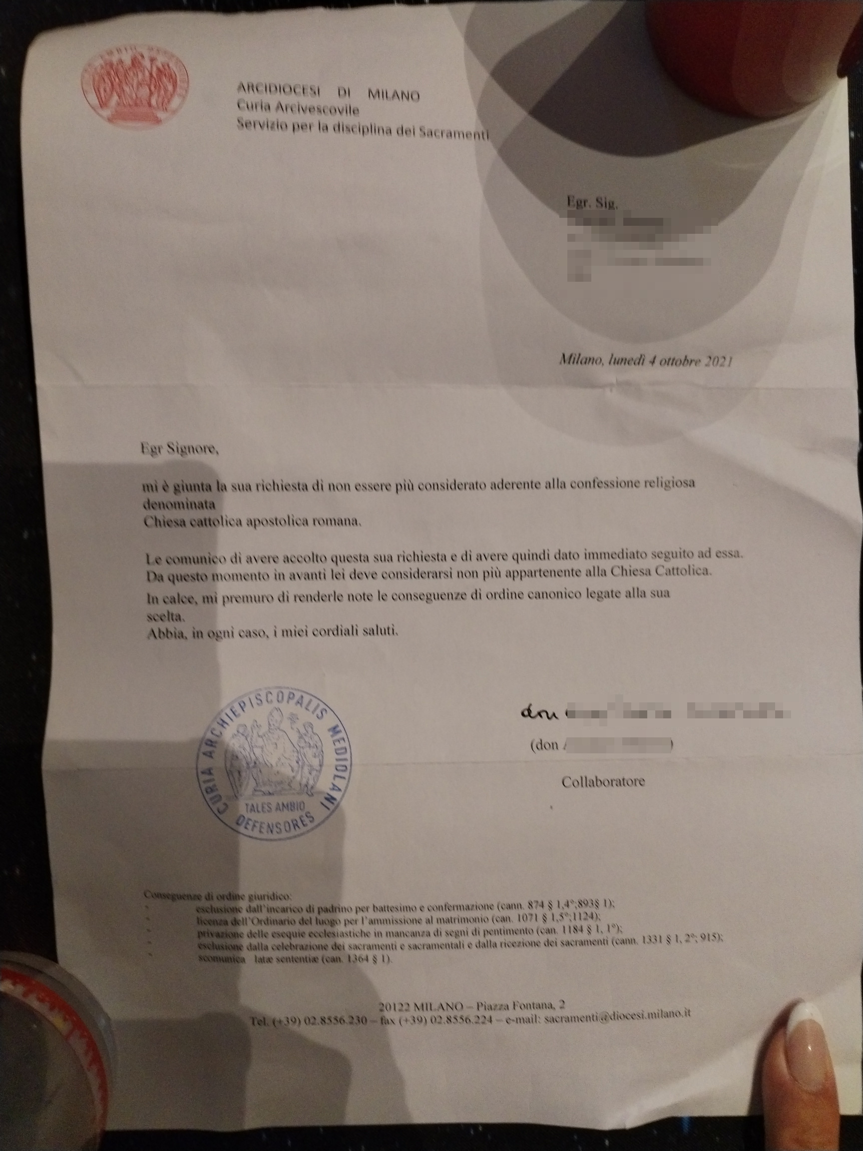 Una persona ha chiesto la rettifica dei dati relativi al proprio battesimo avvenuto a S. Tecla nel Duomo di Milano - MILANO (MI) il 04/10/2023, dichiarando di non voler più far parte della Chiesa Cattolica.
