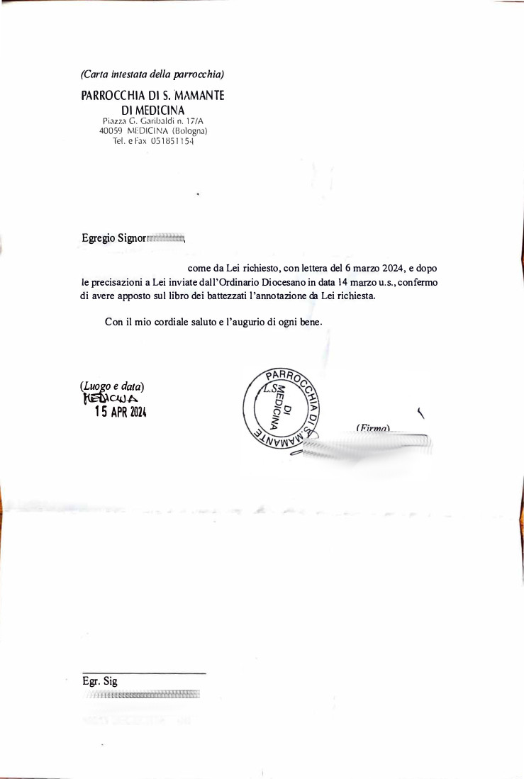 Una persona ha chiesto la rettifica dei dati relativi al proprio battesimo avvenuto a S. Mamante di Medicina - MEDICINA (BO) il 15/04/2024, dichiarando di non voler più far parte della Chiesa Cattolica.