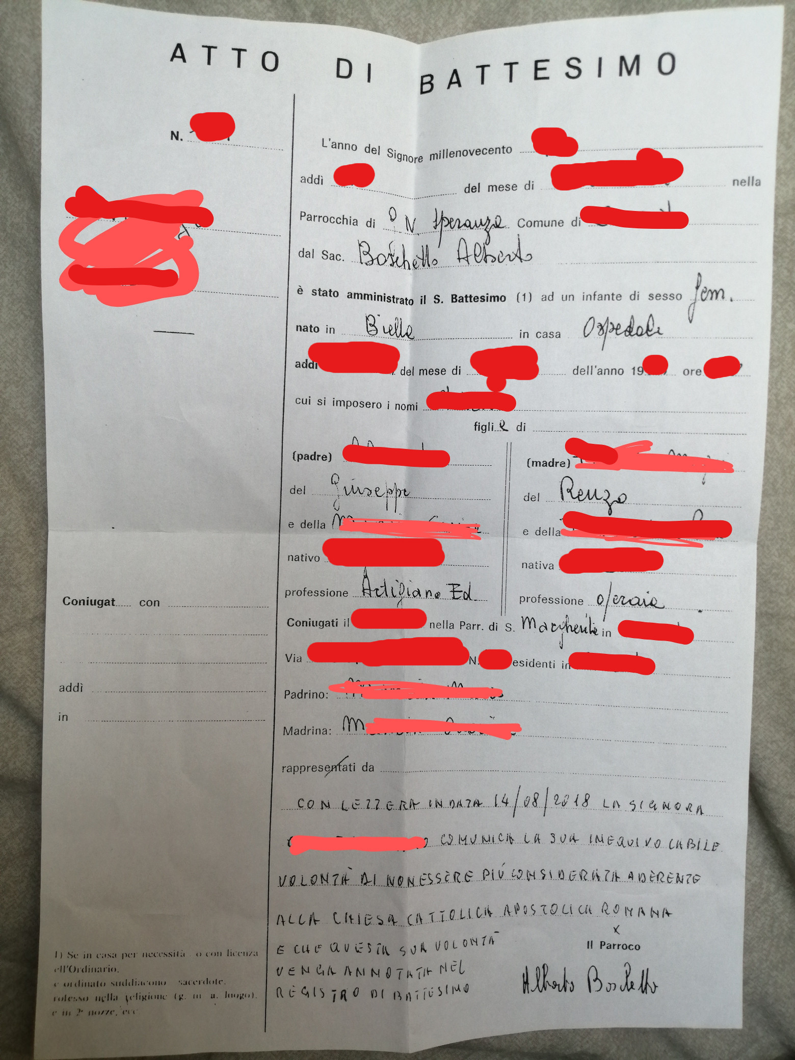 Una persona ha chiesto la rettifica dei dati relativi al proprio battesimo avvenuto a Gesù Nostra Speranza - COSSATO (BI) il 31/08/2018, dichiarando di non voler più far parte della Chiesa Cattolica.