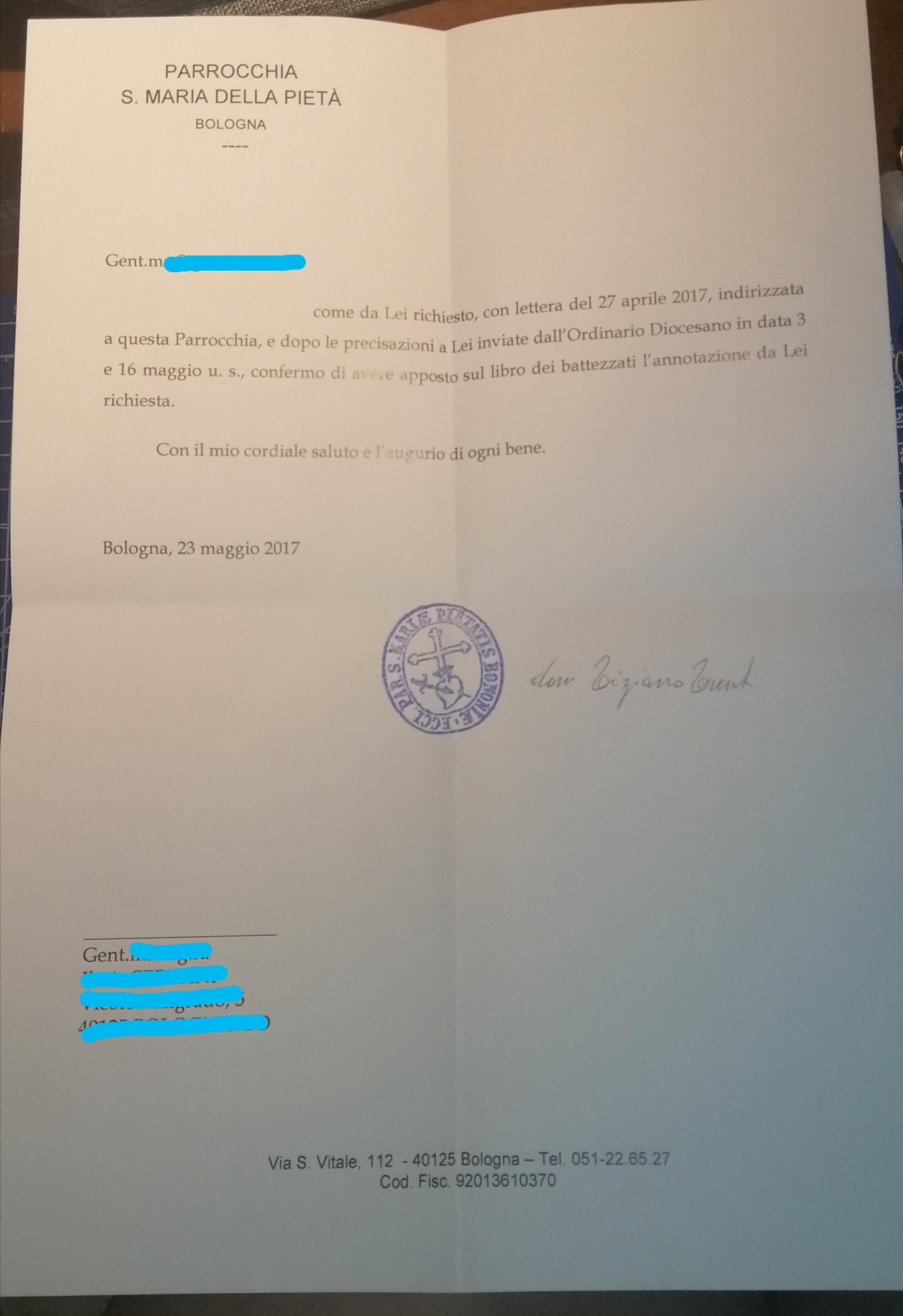 Una persona ha chiesto la rettifica dei dati relativi al proprio battesimo avvenuto a S. Maria della Pietà - BOLOGNA (BO) il 23/05/2017, dichiarando di non voler più far parte della Chiesa Cattolica.