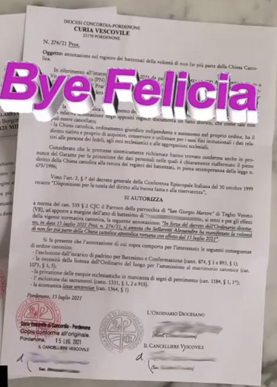 Una persona ha chiesto la rettifica dei dati relativi al proprio battesimo avvenuto a S. Giacomo Apostolo - FIUME VENETO (PN) il 09/07/2021, dichiarando di non voler più far parte della Chiesa Cattolica.
