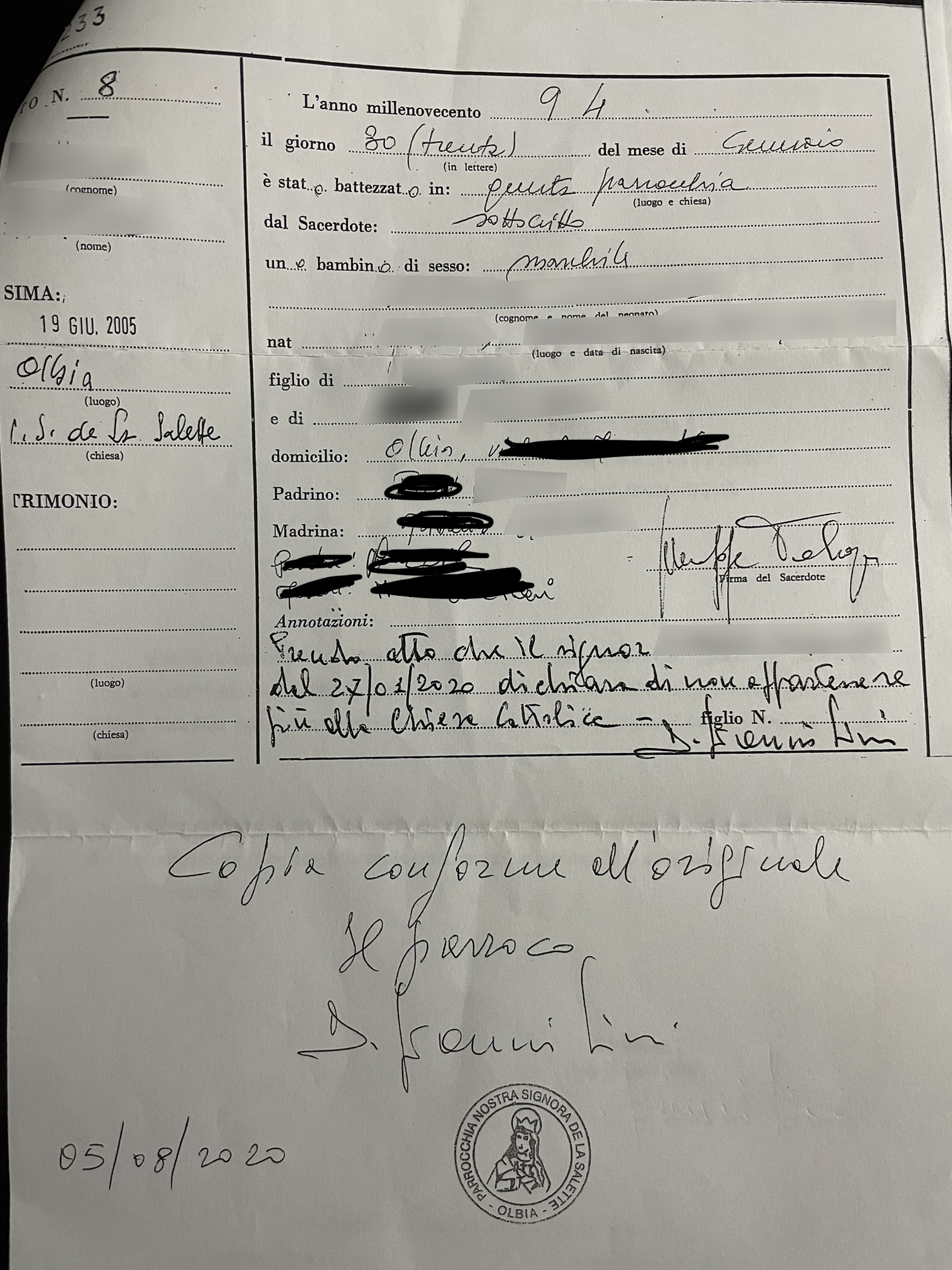 Una persona ha chiesto la rettifica dei dati relativi al proprio battesimo avvenuto a Nostra Signora de La Salette - OLBIA (SS) il 05/08/2020, dichiarando di non voler più far parte della Chiesa Cattolica.