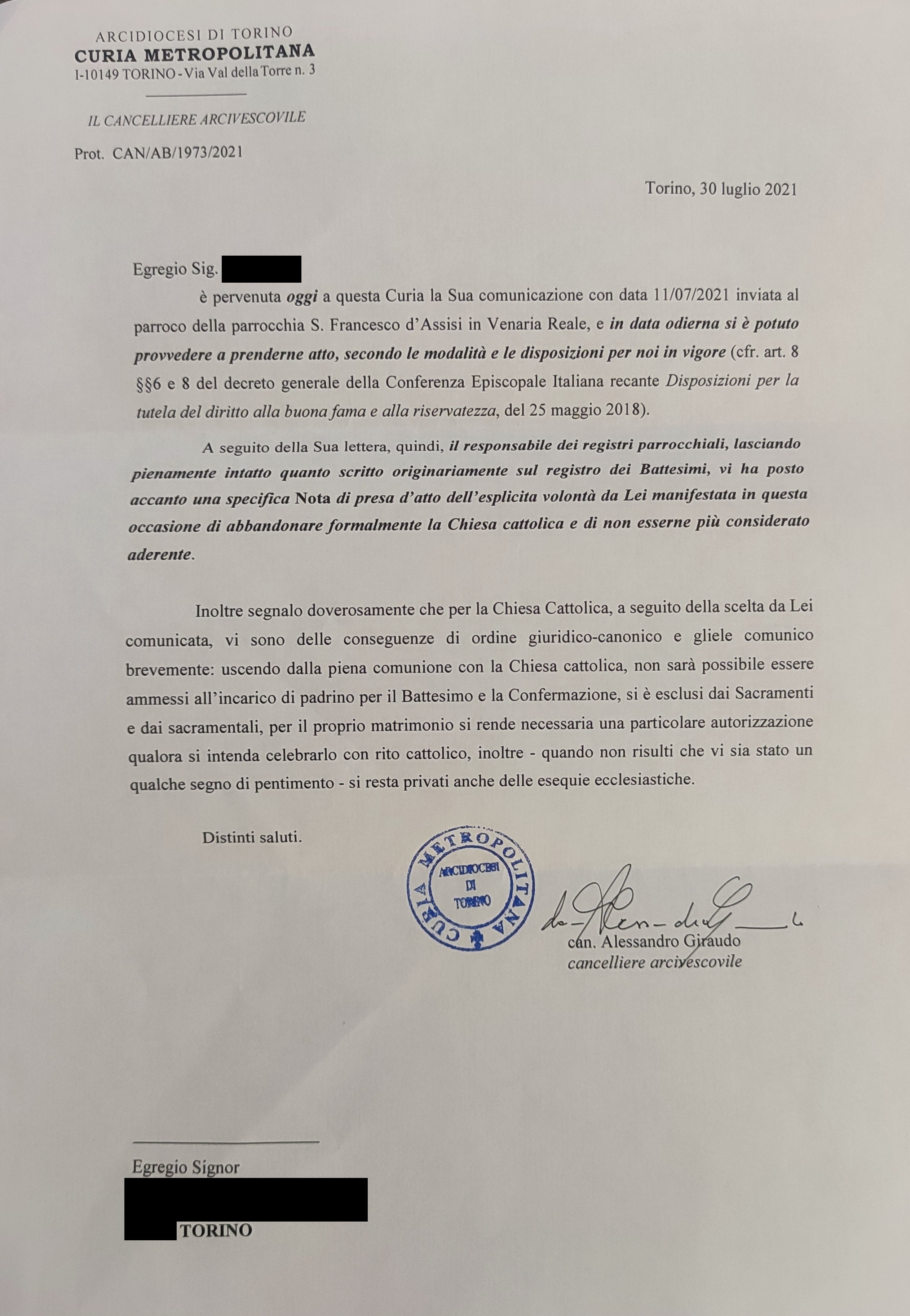 Una persona ha chiesto la rettifica dei dati relativi al proprio battesimo avvenuto a S. Francesco d'Assisi - VENARIA REALE (TO) il 05/08/2021, dichiarando di non voler più far parte della Chiesa Cattolica.