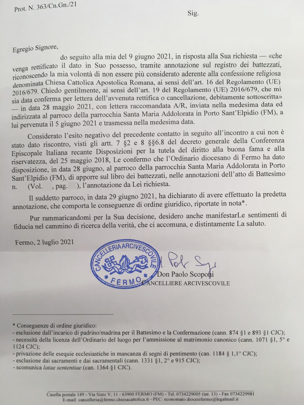 Domanda inoltrata in data 28 maggio 2021, prima risposta ricevuta il 15 giugno 2021, nonostante fossi stato assai perentorio nello specificare che non c'è spazio per alcun ripensamento. Ho dovuto attendere, quindi, ulteriori tre settimane prima di poter ricevere la conferma dell'avvenuta annotazione sui registri parrocchiali.