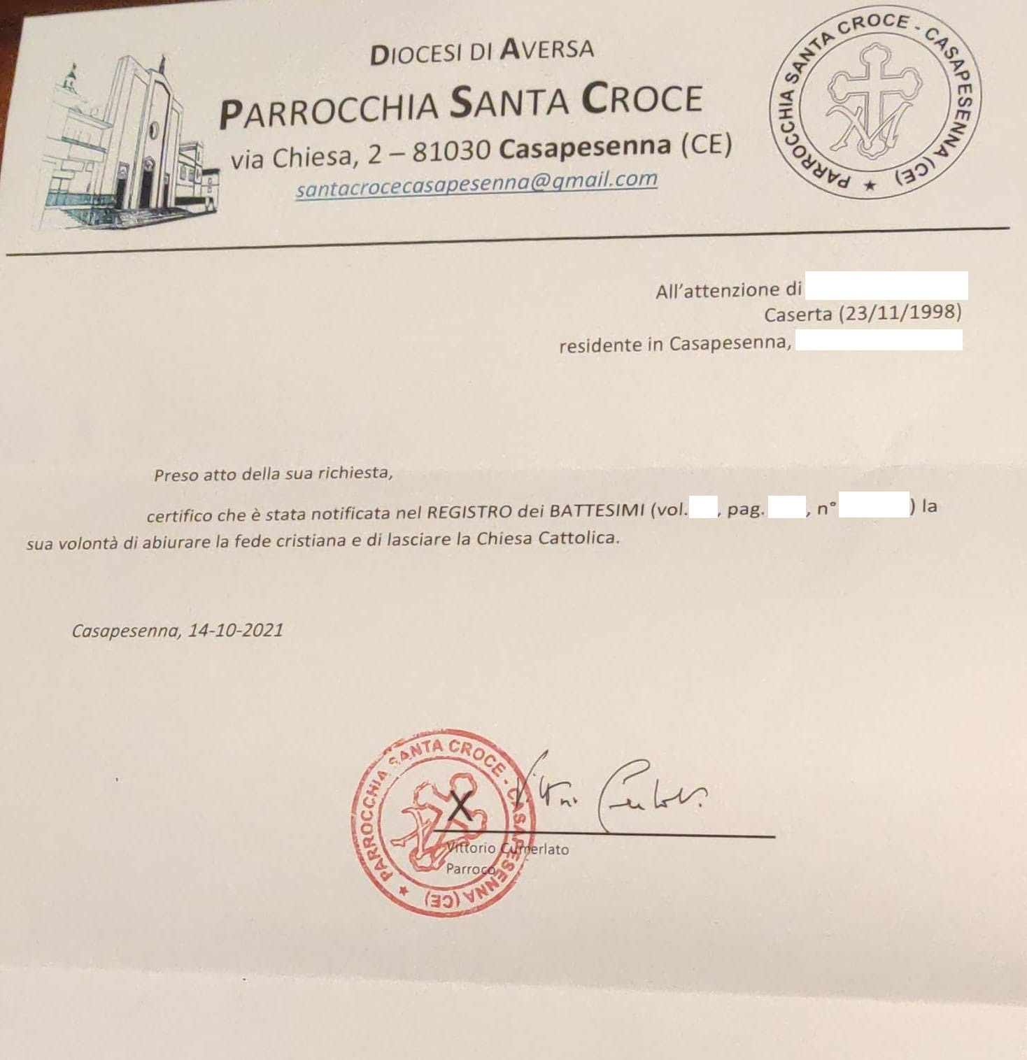 Una persona ha chiesto la rettifica dei dati relativi al proprio battesimo avvenuto a S. Croce - CASAPESENNA (CE) il 15/10/2021, dichiarando di non voler più far parte della Chiesa Cattolica.