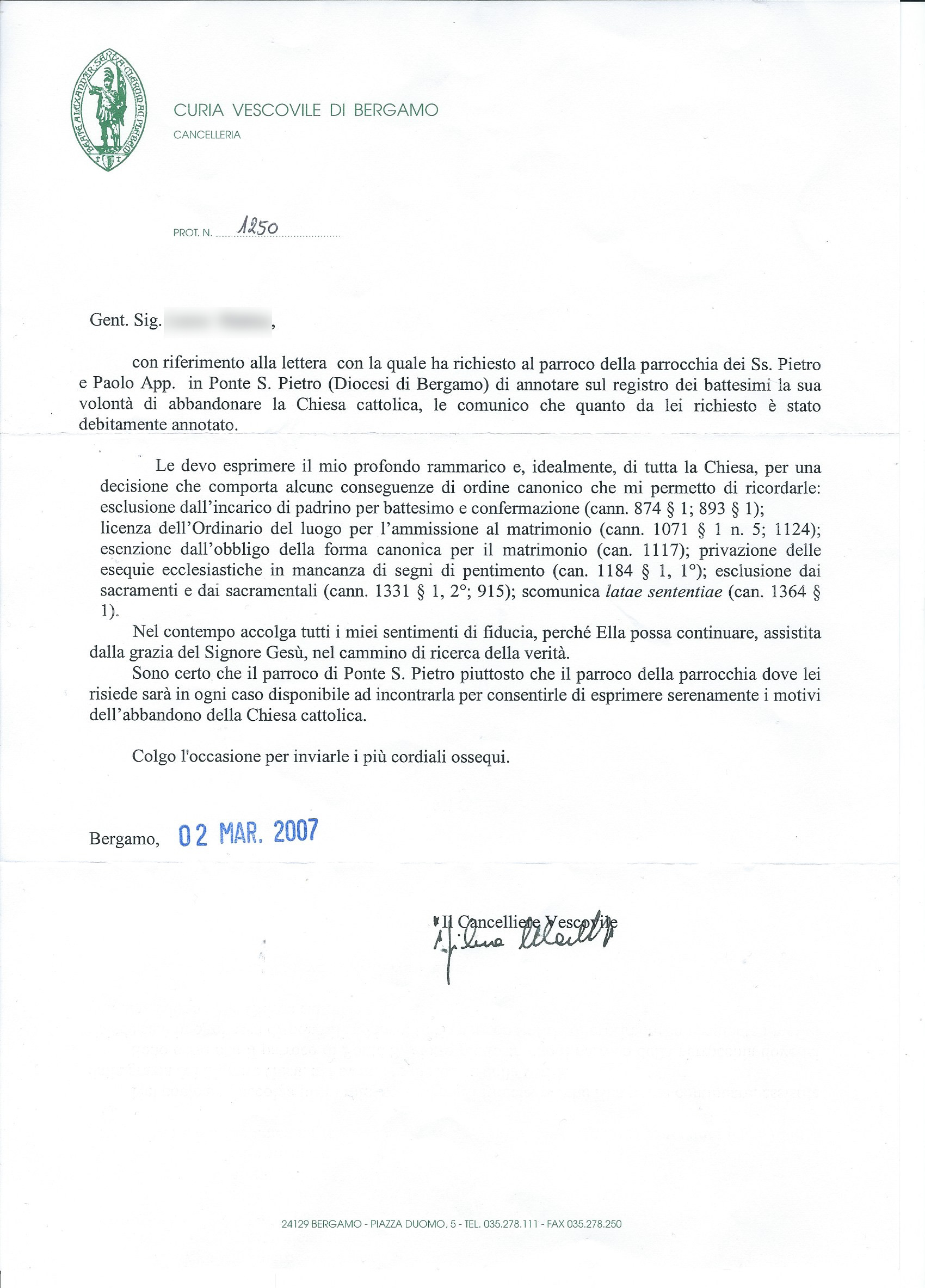Una persona ha chiesto la rettifica dei dati relativi al proprio battesimo avvenuto a S. Pietro Apostolo - PONTE SAN PIETRO (BG) il 02/03/2007, dichiarando di non voler più far parte della Chiesa Cattolica.