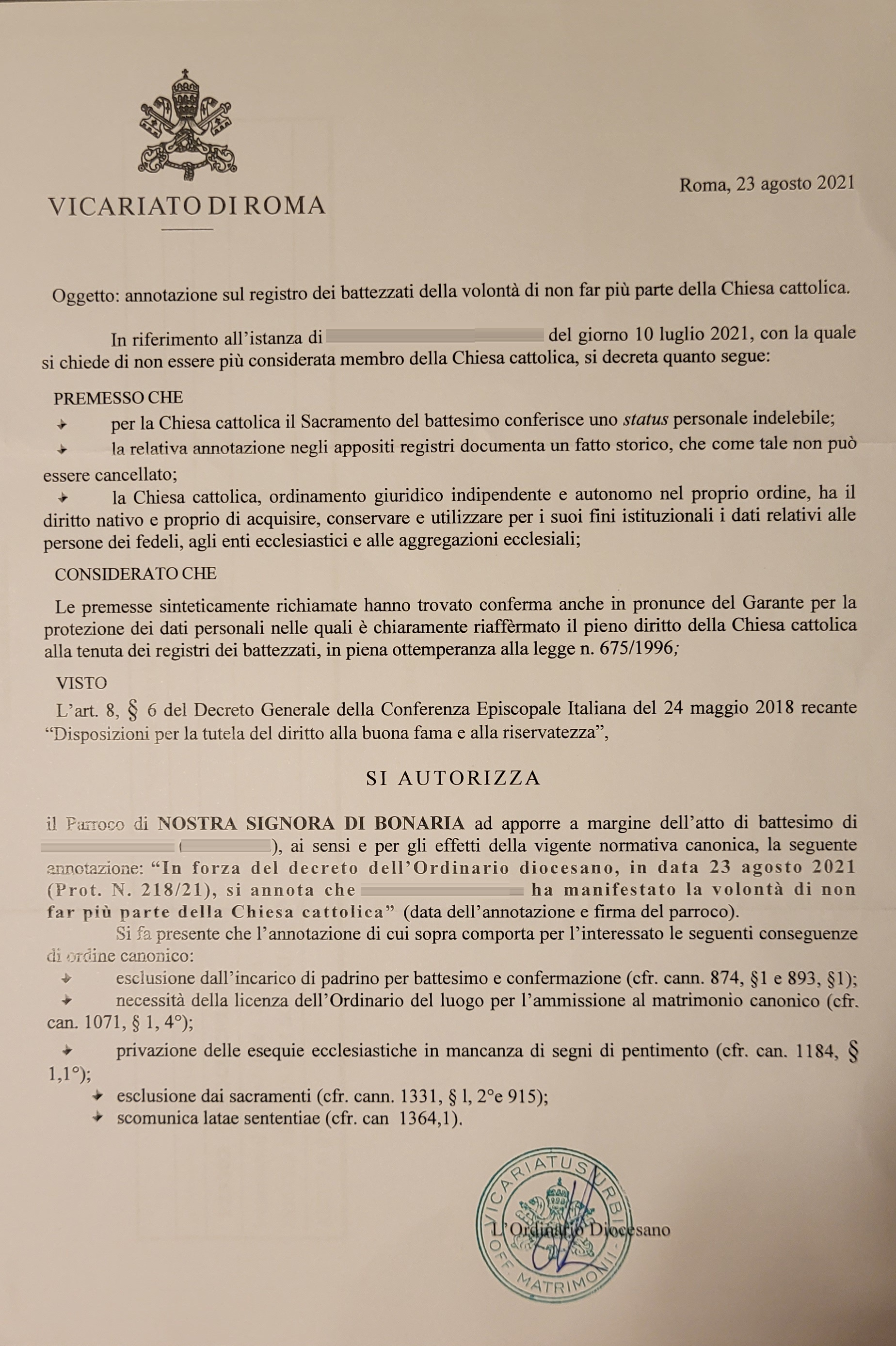 Una persona ha chiesto la rettifica dei dati relativi al proprio battesimo avvenuto a Nostra Signora di Bonaria - ROMA (RM) il 23/08/2021, dichiarando di non voler più far parte della Chiesa Cattolica.