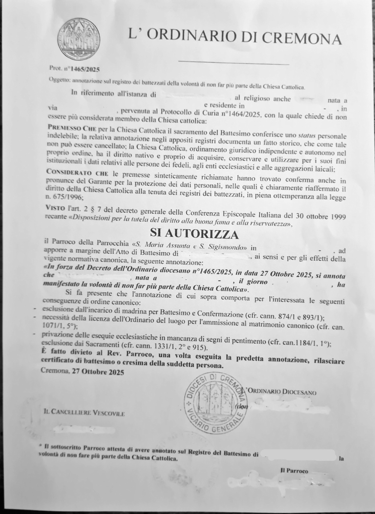 Una persona ha chiesto la rettifica dei dati relativi al proprio battesimo avvenuto a S. Maria Assunta e S. Sigismondo - RIVOLTA D'ADDA (CR) il 27/10/2025, dichiarando di non voler più far parte della Chiesa Cattolica.