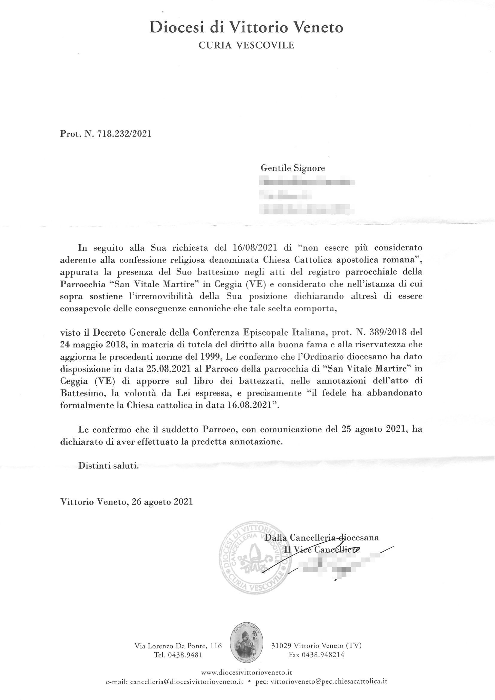 Una persona ha chiesto la rettifica dei dati relativi al proprio battesimo avvenuto a S. Vitale Martire - CEGGIA (VE) il 26/08/2021, dichiarando di non voler più far parte della Chiesa Cattolica.