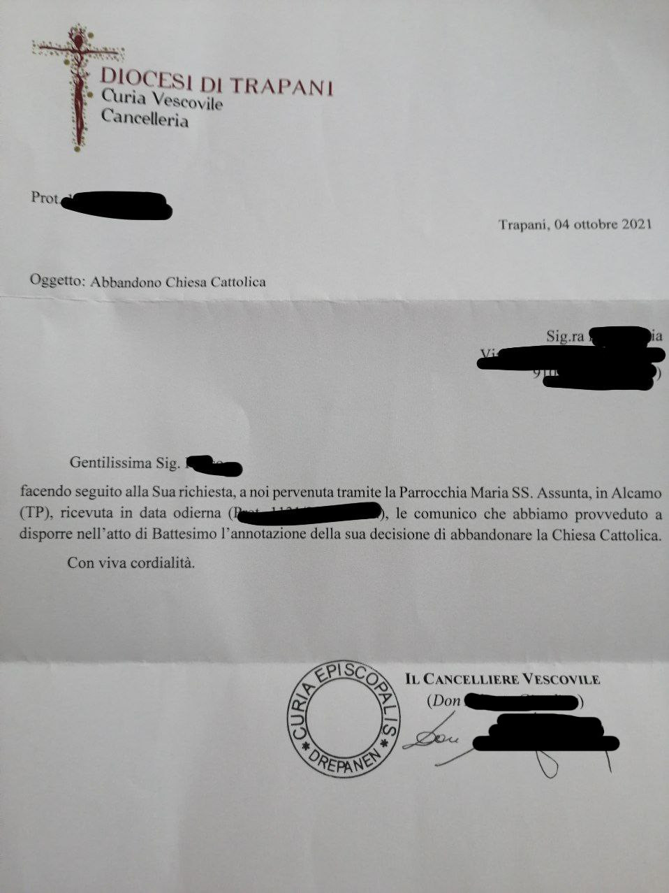 Una persona ha chiesto la rettifica dei dati relativi al proprio battesimo avvenuto a Santa Maria Assunta - ALCAMO (TP) il 04/10/2021, dichiarando di non voler più far parte della Chiesa Cattolica.