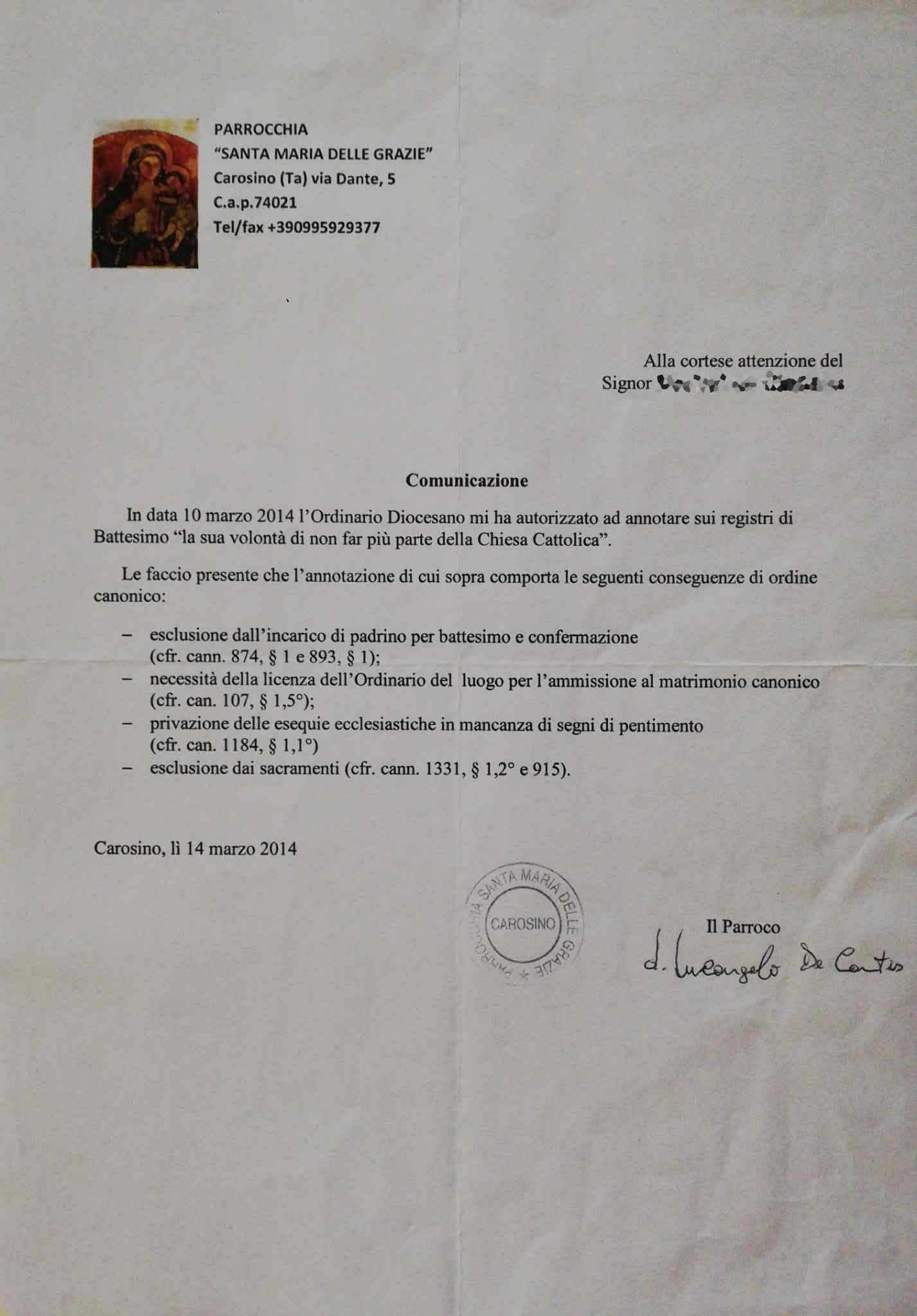 Una persona ha chiesto la rettifica dei dati relativi al proprio battesimo avvenuto a S. Maria delle Grazie - CAROSINO (TA) il 14/03/2014, dichiarando di non voler più far parte della Chiesa Cattolica.