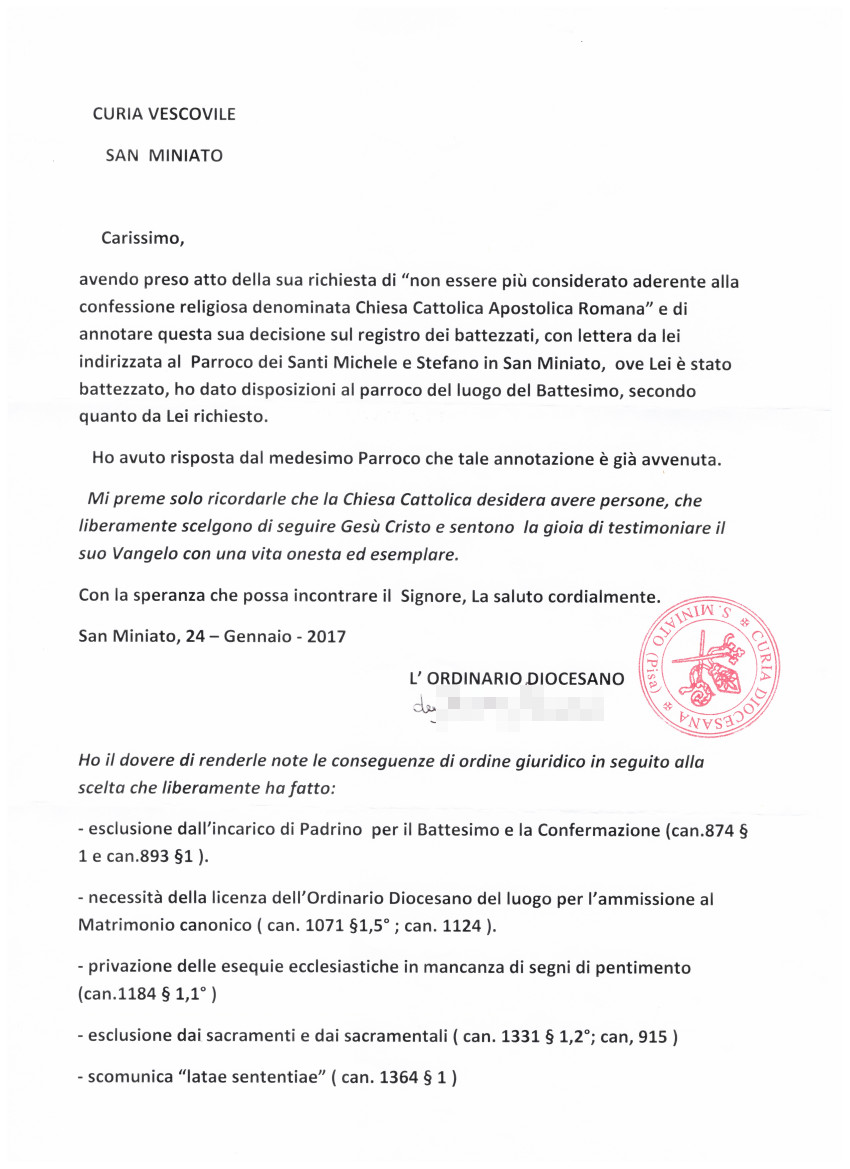 Una persona ha chiesto la rettifica dei dati relativi al proprio battesimo avvenuto a Santi Michele e Stefano - SAN MINIATO (PI) il 24/01/2017, dichiarando di non voler più far parte della Chiesa Cattolica.