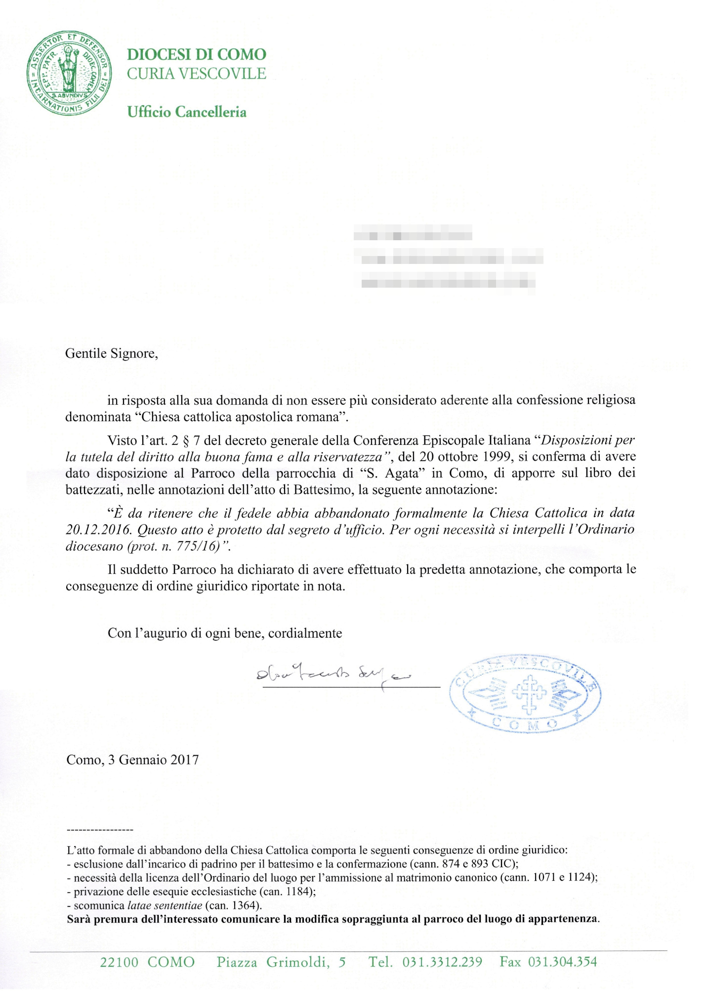 Una persona ha chiesto la rettifica dei dati relativi al proprio battesimo avvenuto a S. Agata - COMO (CO) il 03/01/2017, dichiarando di non voler più far parte della Chiesa Cattolica.