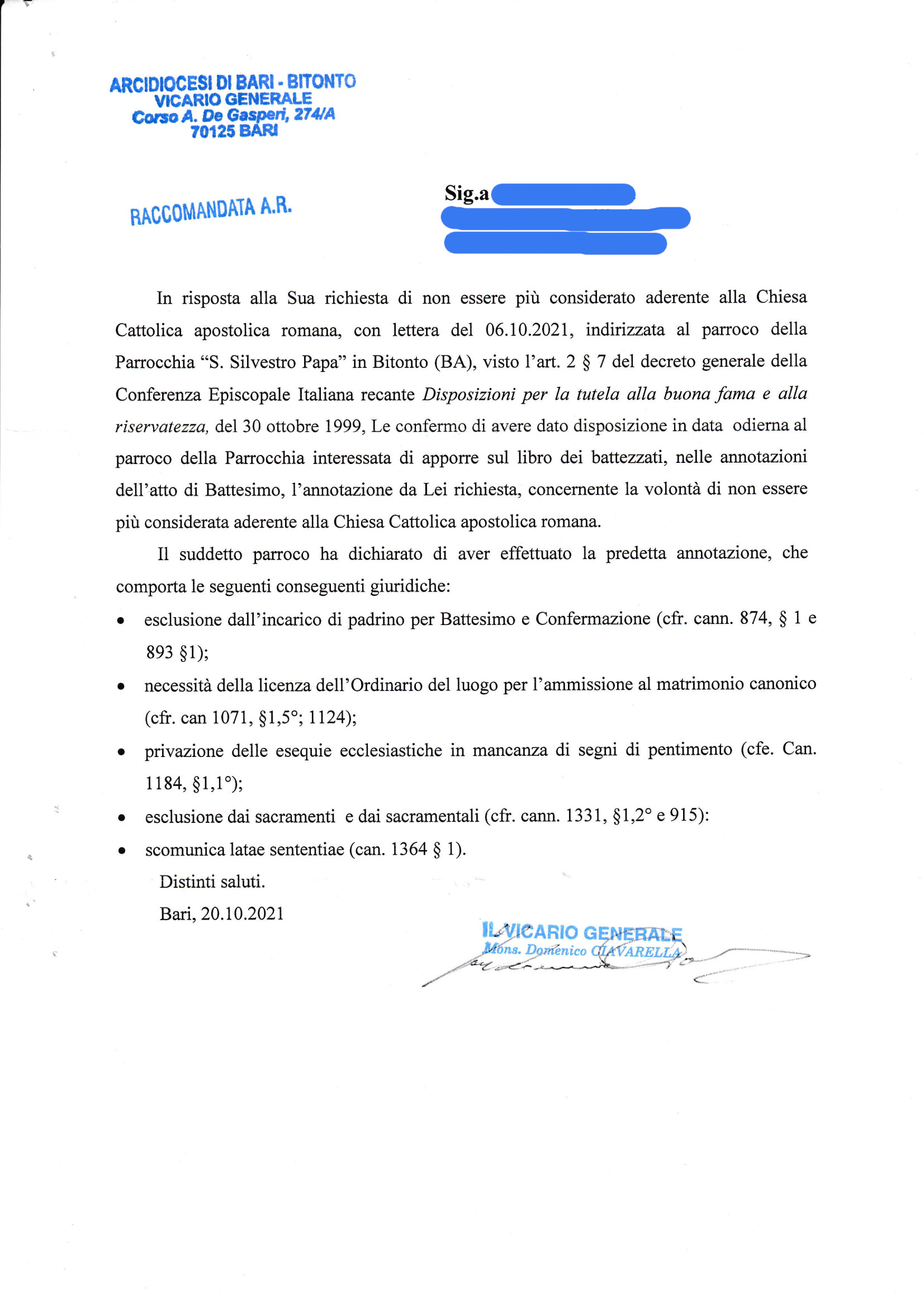 Una persona ha chiesto la rettifica dei dati relativi al proprio battesimo avvenuto a S. Silvestro Papa - BITONTO (BA) il 20/10/2021, dichiarando di non voler più far parte della Chiesa Cattolica.