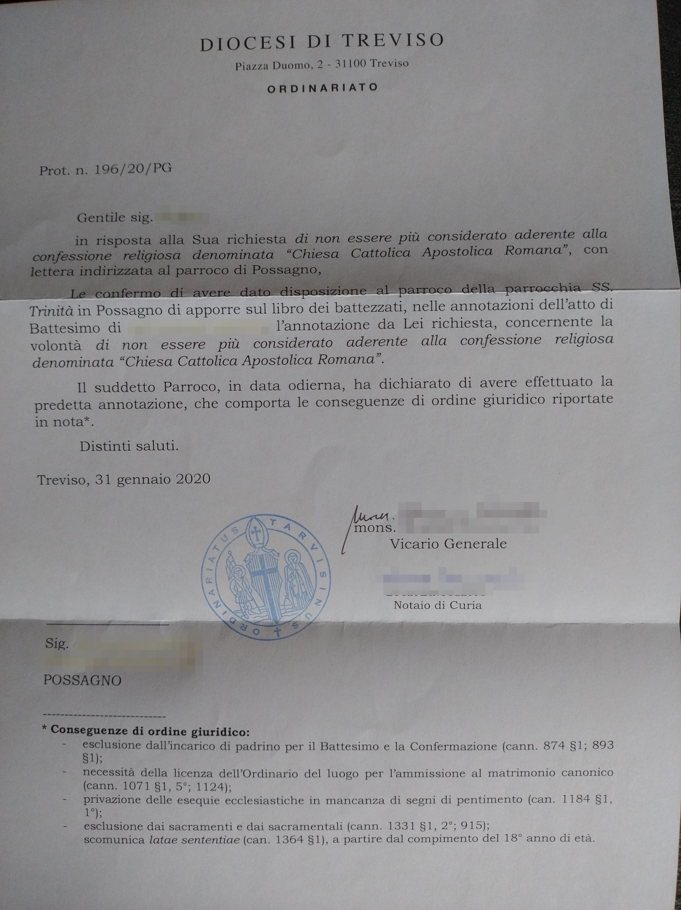 Una persona ha chiesto la rettifica dei dati relativi al proprio battesimo avvenuto a Ss. Trinità - POSSAGNO (TV) il 31/01/2020, dichiarando di non voler più far parte della Chiesa Cattolica.