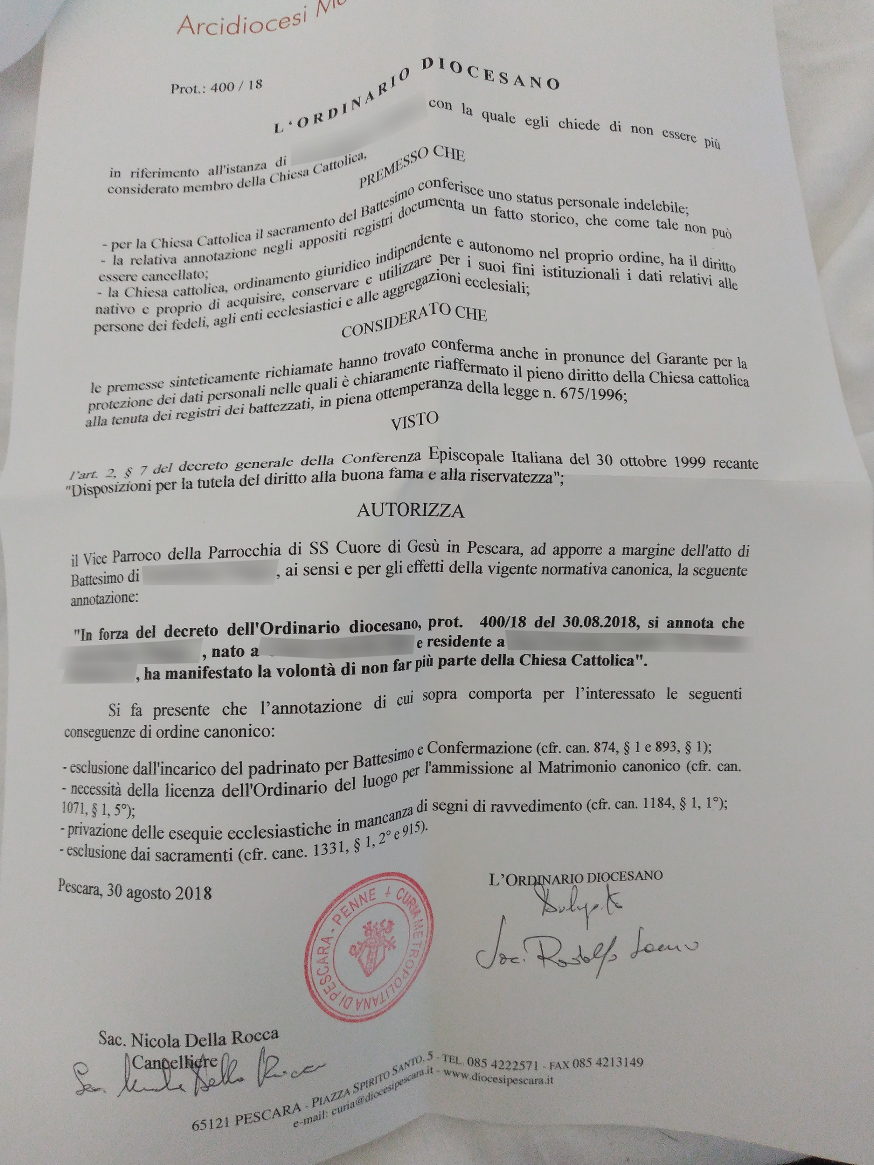 Una persona ha chiesto la rettifica dei dati relativi al proprio battesimo avvenuto a Sacro Cuore di Gesù - PESCARA (PE) il 30/08/2018, dichiarando di non voler più far parte della Chiesa Cattolica.