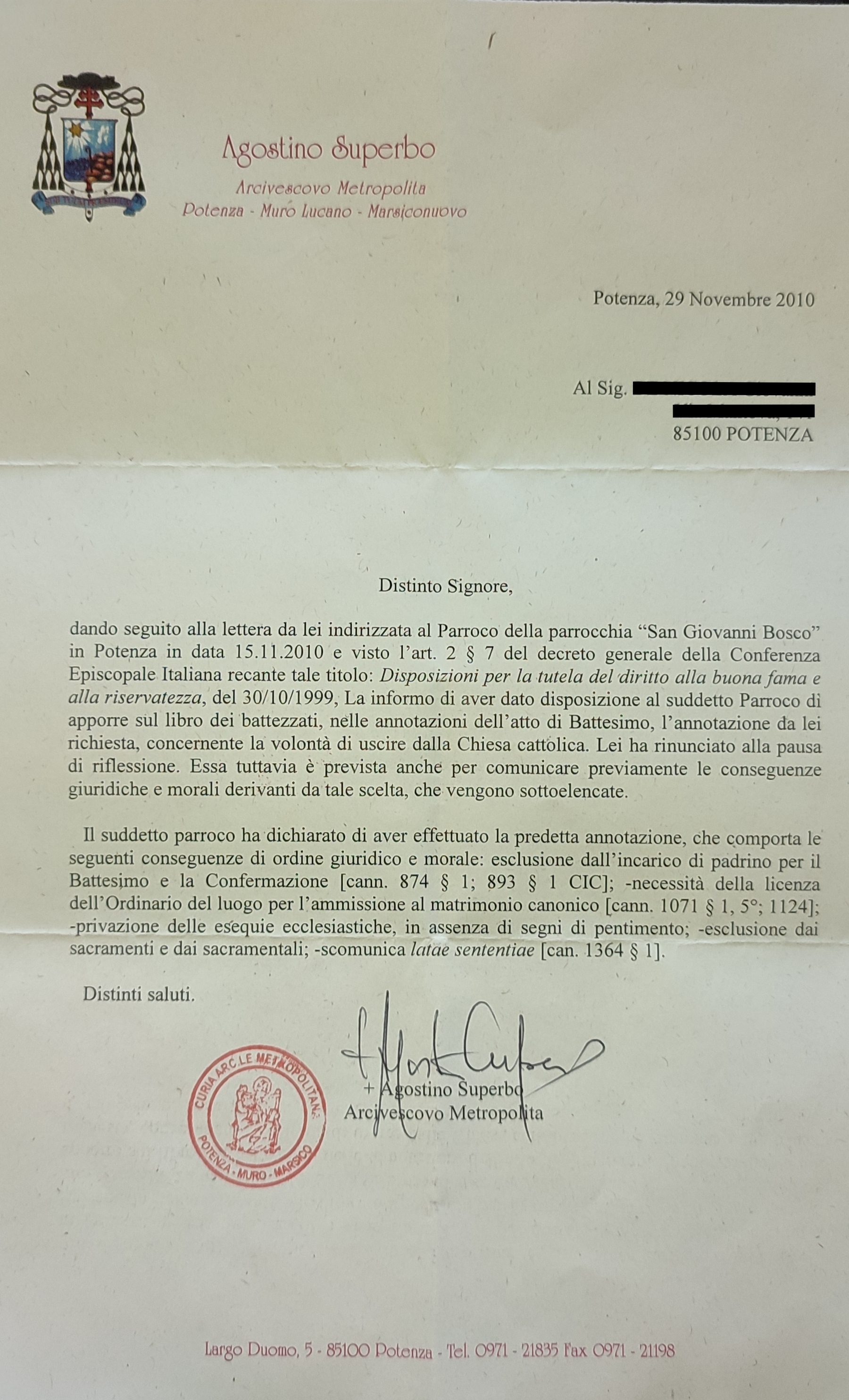 Una persona ha chiesto la rettifica dei dati relativi al proprio battesimo avvenuto a S. Giovanni Bosco - POTENZA (PZ) il 29/11/2010, dichiarando di non voler più far parte della Chiesa Cattolica.