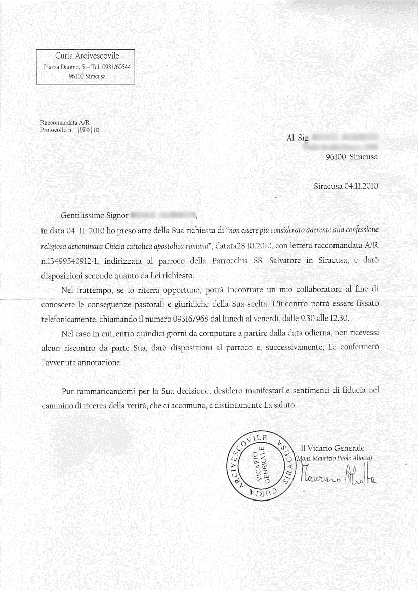 Una persona ha chiesto la rettifica dei dati relativi al proprio battesimo avvenuto a Ss. Salvatore - SIRACUSA (SR) il 04/11/2010, dichiarando di non voler più far parte della Chiesa Cattolica.