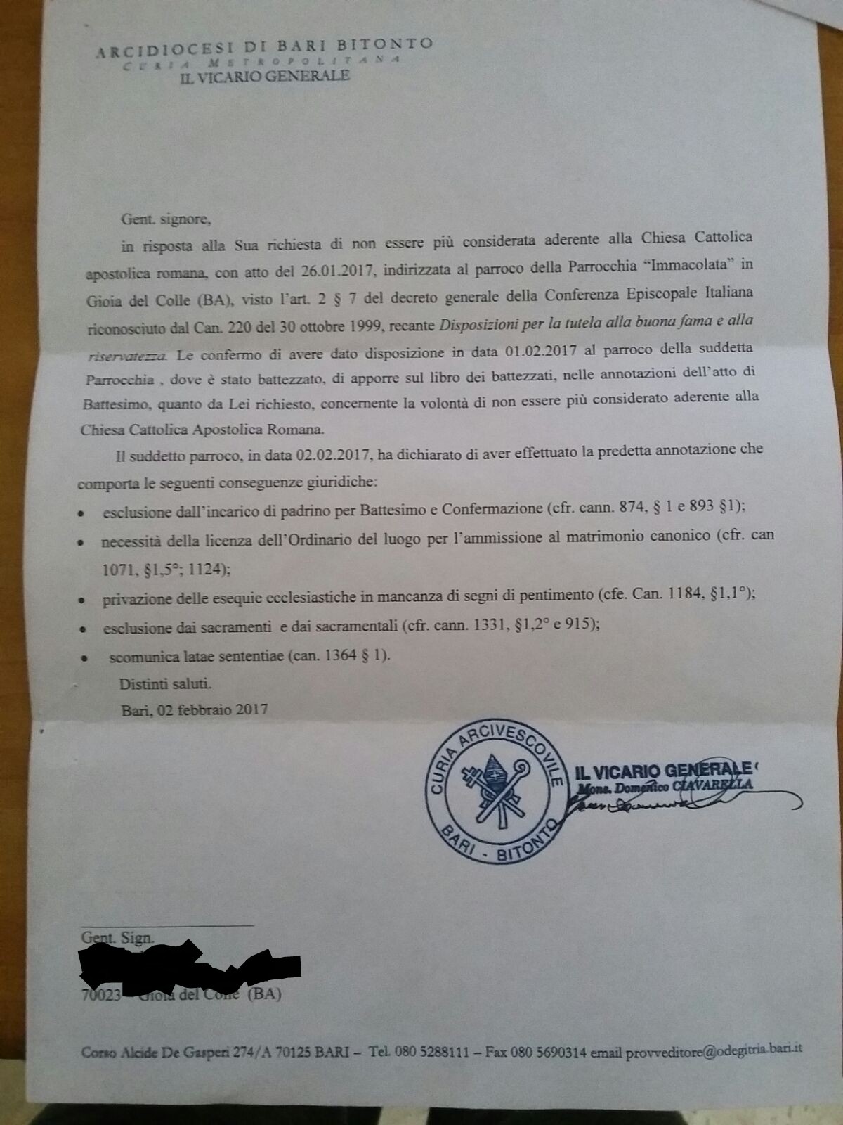 Gesto fatto per coerenza innanzi tutto, poi per dovere civico verso tutte quelle persone i cui diritti sono frustrati dalla Chiesa Cattolica, infine, con un pizzico di soddisfazione, per poter sostenere a testa alta lo sguardo tronfio e borioso di tutti coloro che in nome di una presunta e sempre più risicata "maggioranza cattolica" frenano e rendono inumana la nostra società, siano essi prelati, politici o semplici cittadini.