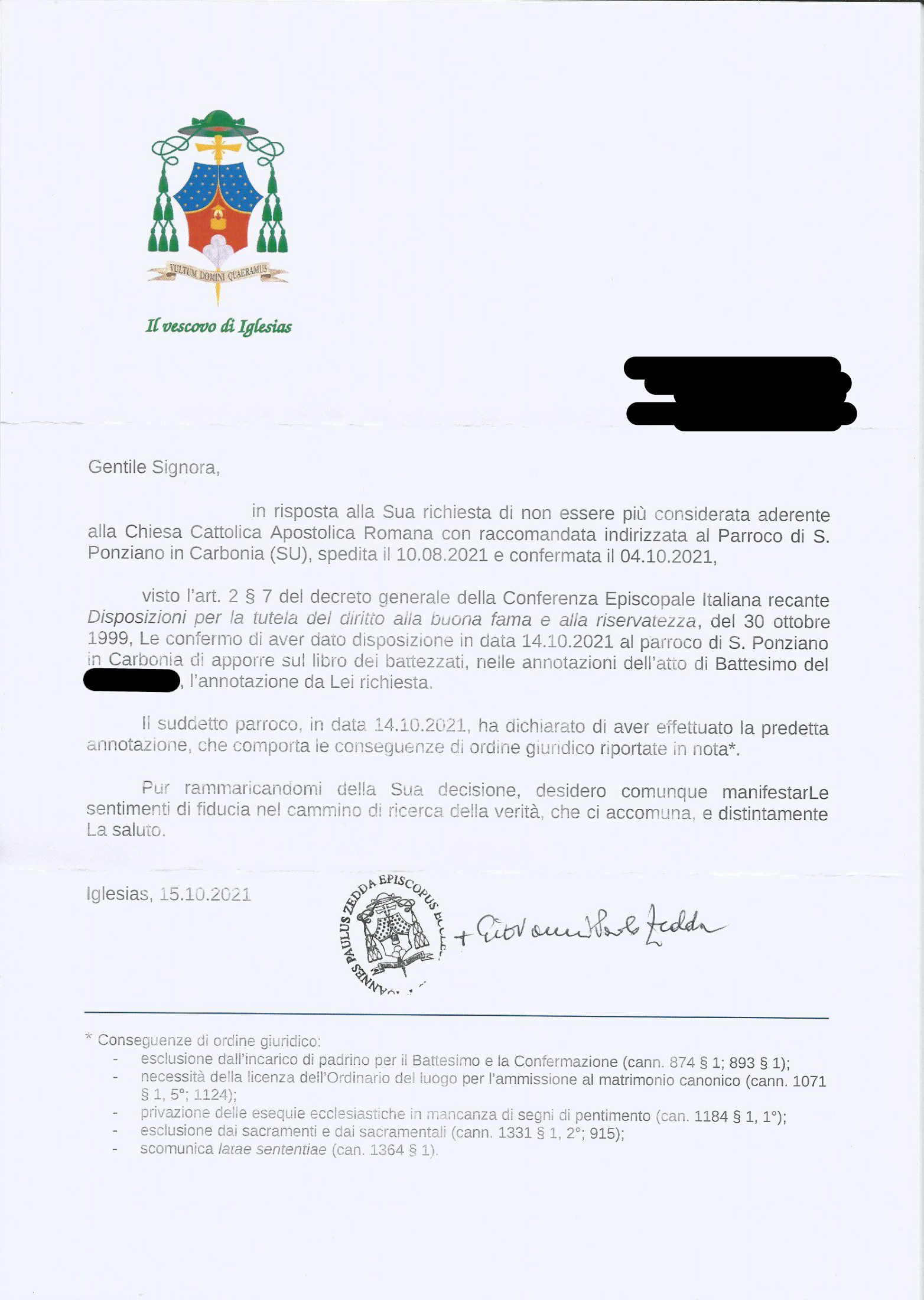 Una persona ha chiesto la rettifica dei dati relativi al proprio battesimo avvenuto a S. Ponziano Pontefice Martire - CARBONIA (SU) il 14/10/2021, dichiarando di non voler più far parte della Chiesa Cattolica.