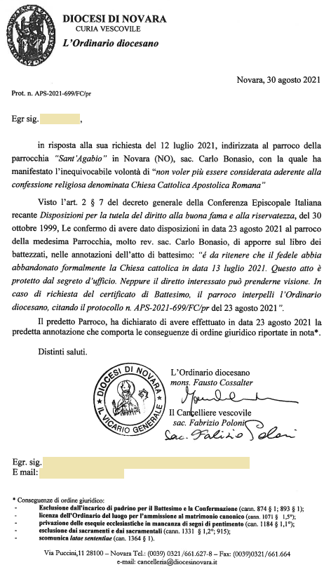 Una persona ha chiesto la rettifica dei dati relativi al proprio battesimo avvenuto a S. Agabio - NOVARA (NO) il 31/08/2021, dichiarando di non voler più far parte della Chiesa Cattolica.