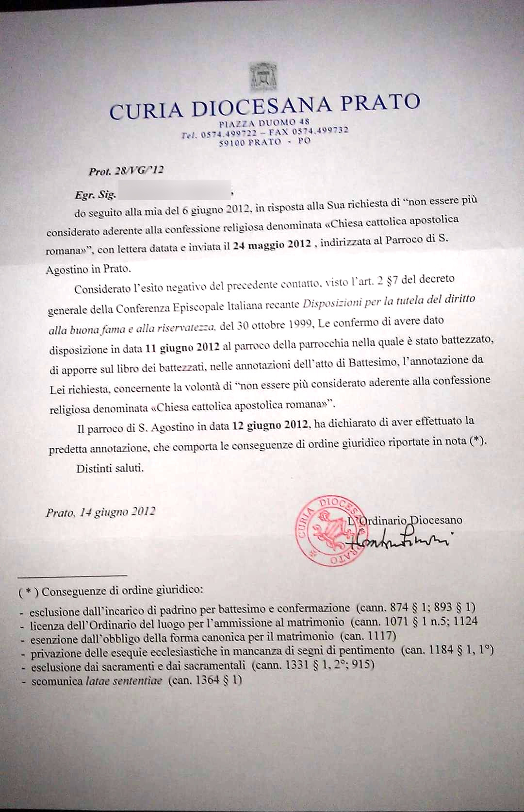 Una persona ha chiesto la rettifica dei dati relativi al proprio battesimo avvenuto a S. Agostino - PRATO (PO) il 14/06/2012, dichiarando di non voler più far parte della Chiesa Cattolica.