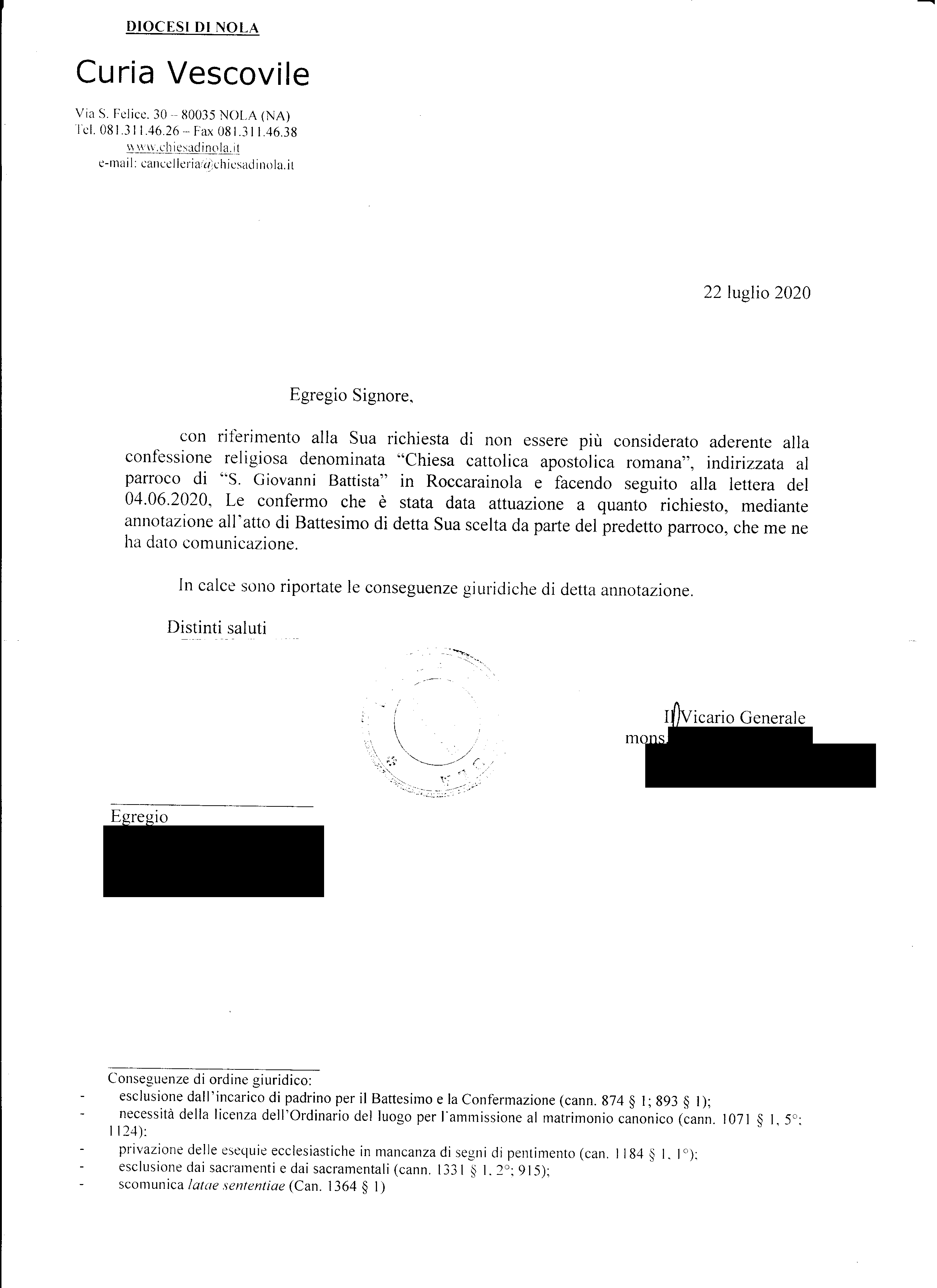 Una persona ha chiesto la rettifica dei dati relativi al proprio battesimo avvenuto a S. Giovanni Battista - ROCCARAINOLA (NA) il 22/07/2020, dichiarando di non voler più far parte della Chiesa Cattolica.