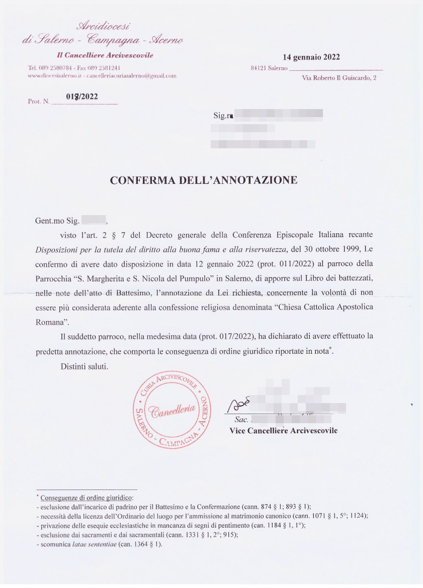 Una persona ha chiesto la rettifica dei dati relativi al proprio battesimo avvenuto a S. Margherita di Pastena e S. Nicola De Pumpulo - SALERNO (SA) il 14/01/2022, dichiarando di non voler più far parte della Chiesa Cattolica.