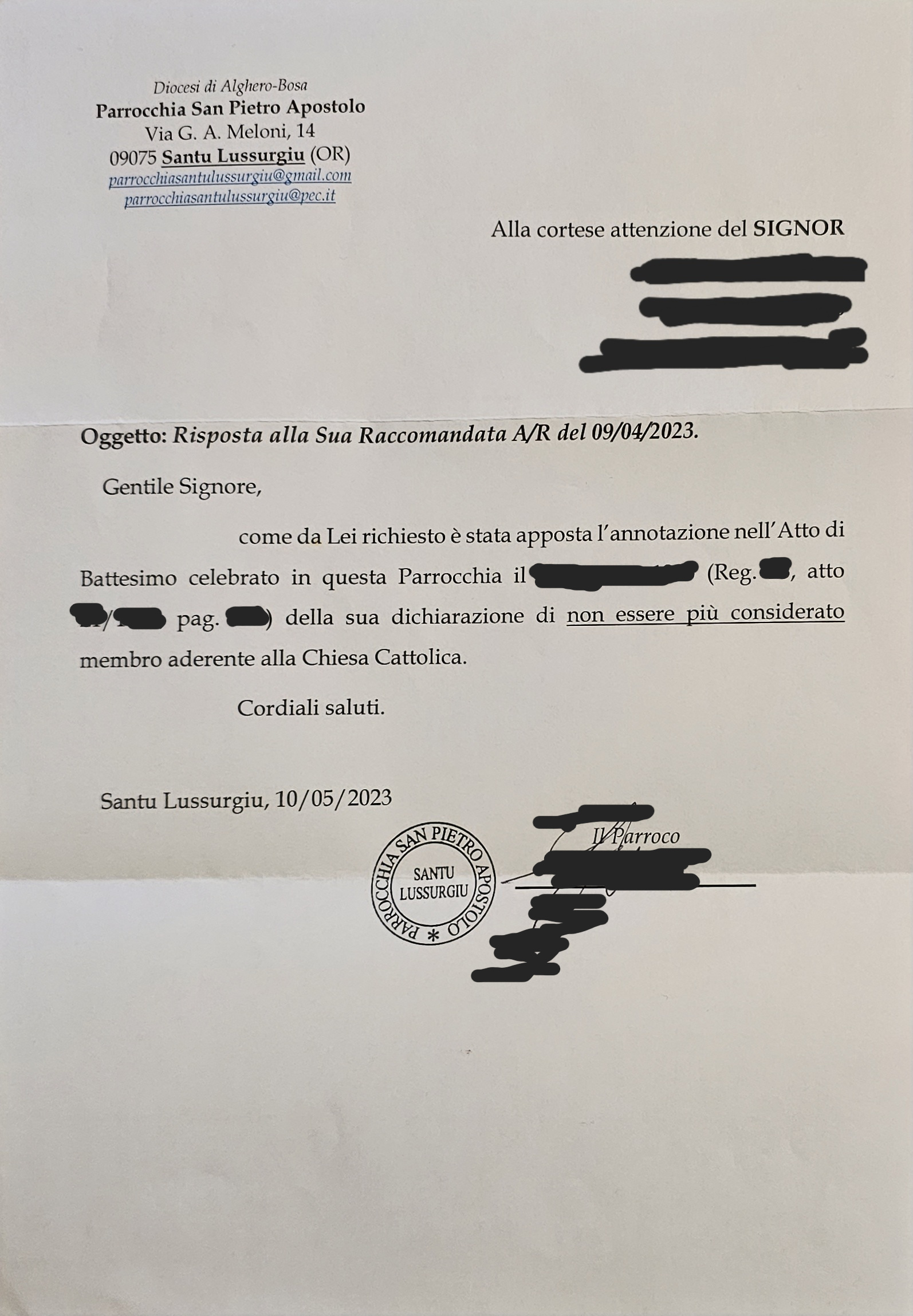 Una persona ha chiesto la rettifica dei dati relativi al proprio battesimo avvenuto a S. Pietro Apostolo - SANTU LUSSURGIU (OR) il 10/05/2023, dichiarando di non voler più far parte della Chiesa Cattolica.