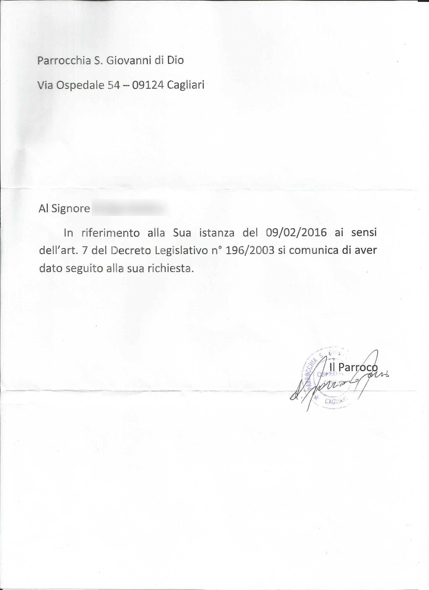 Una persona ha chiesto la rettifica dei dati relativi al proprio battesimo avvenuto a San Giovanni di Dio - CAGLIARI (CA) il 22/02/2016, dichiarando di non voler più far parte della Chiesa Cattolica.