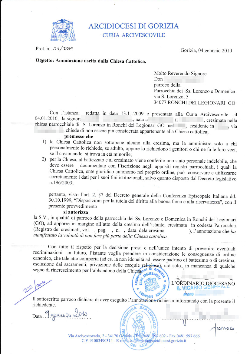 Una persona ha chiesto la rettifica dei dati relativi al proprio battesimo avvenuto a Santi Lorenzo e Domenica - RONCHI DEI LEGIONARI (GO) il 09/01/2010, dichiarando di non voler più far parte della Chiesa Cattolica.