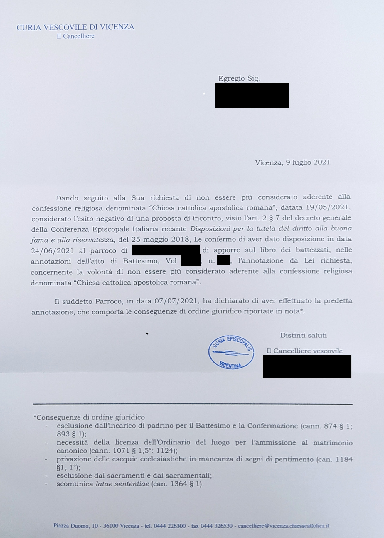 Una persona ha chiesto la rettifica dei dati relativi al proprio battesimo avvenuto a S. Giovanni Battista - CORNEDO VICENTINO (VI) il 09/07/2021, dichiarando di non voler più far parte della Chiesa Cattolica.