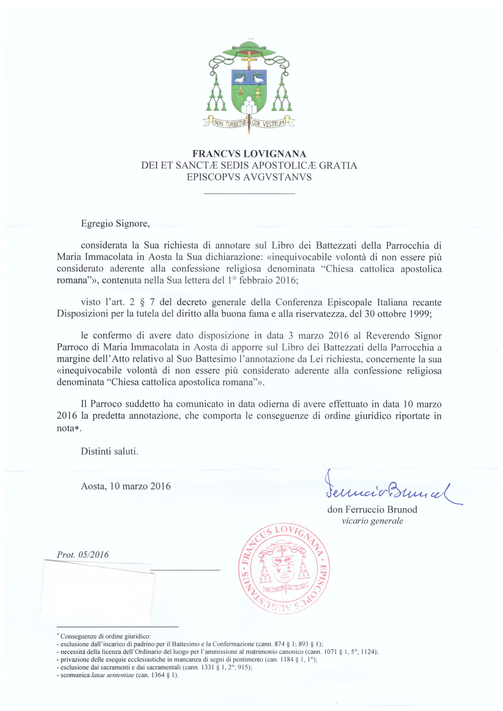 Una persona ha chiesto la rettifica dei dati relativi al proprio battesimo avvenuto a Maria Immacolata - AOSTA (AO) il 10/03/2016, dichiarando di non voler più far parte della Chiesa Cattolica.