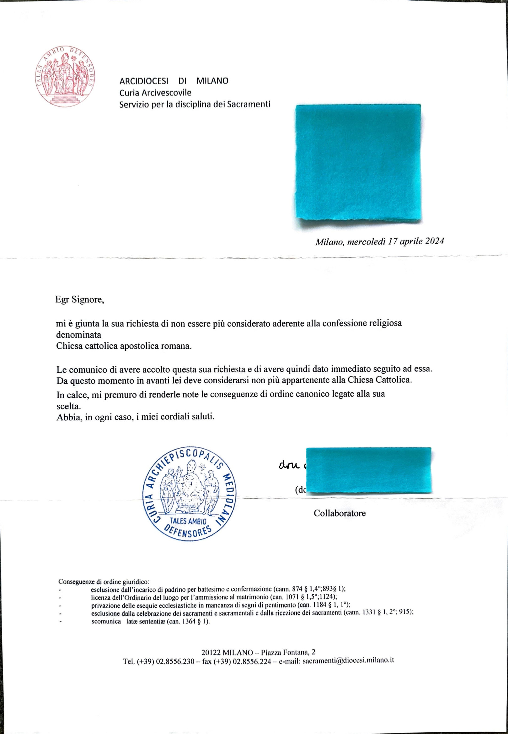 Una persona ha chiesto la rettifica dei dati relativi al proprio battesimo avvenuto a S. Giacomo - ZIBIDO SAN GIACOMO (MI) il 17/04/2024, dichiarando di non voler più far parte della Chiesa Cattolica.